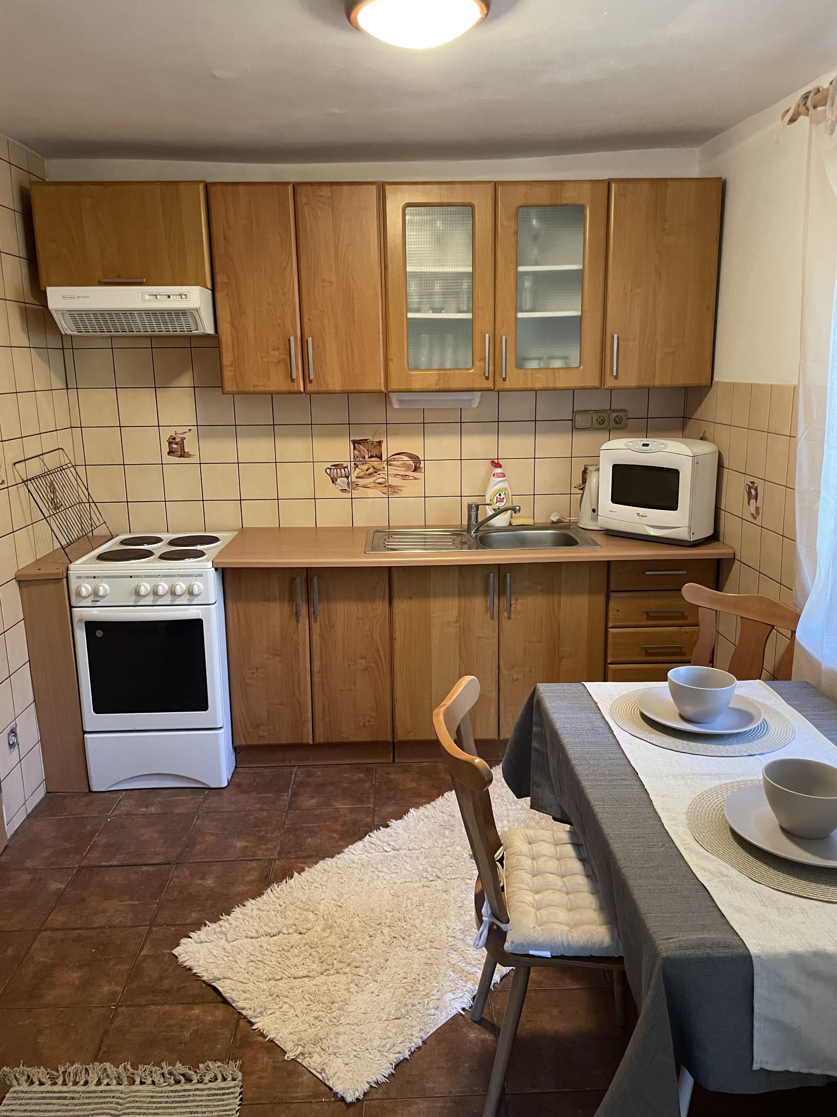 The kitchen includes: fridge, gas stove, microwave, kettle and toaster. It is perfectly equipped, you will not miss anything to spend pleasant moments there.