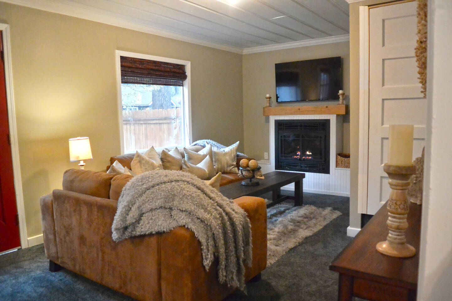 INDOOR LIVING: Beautiful gas fireplace, 3 Smart TVs, DVD player, board games, books, vaulted ceilings, exposed wood beams.