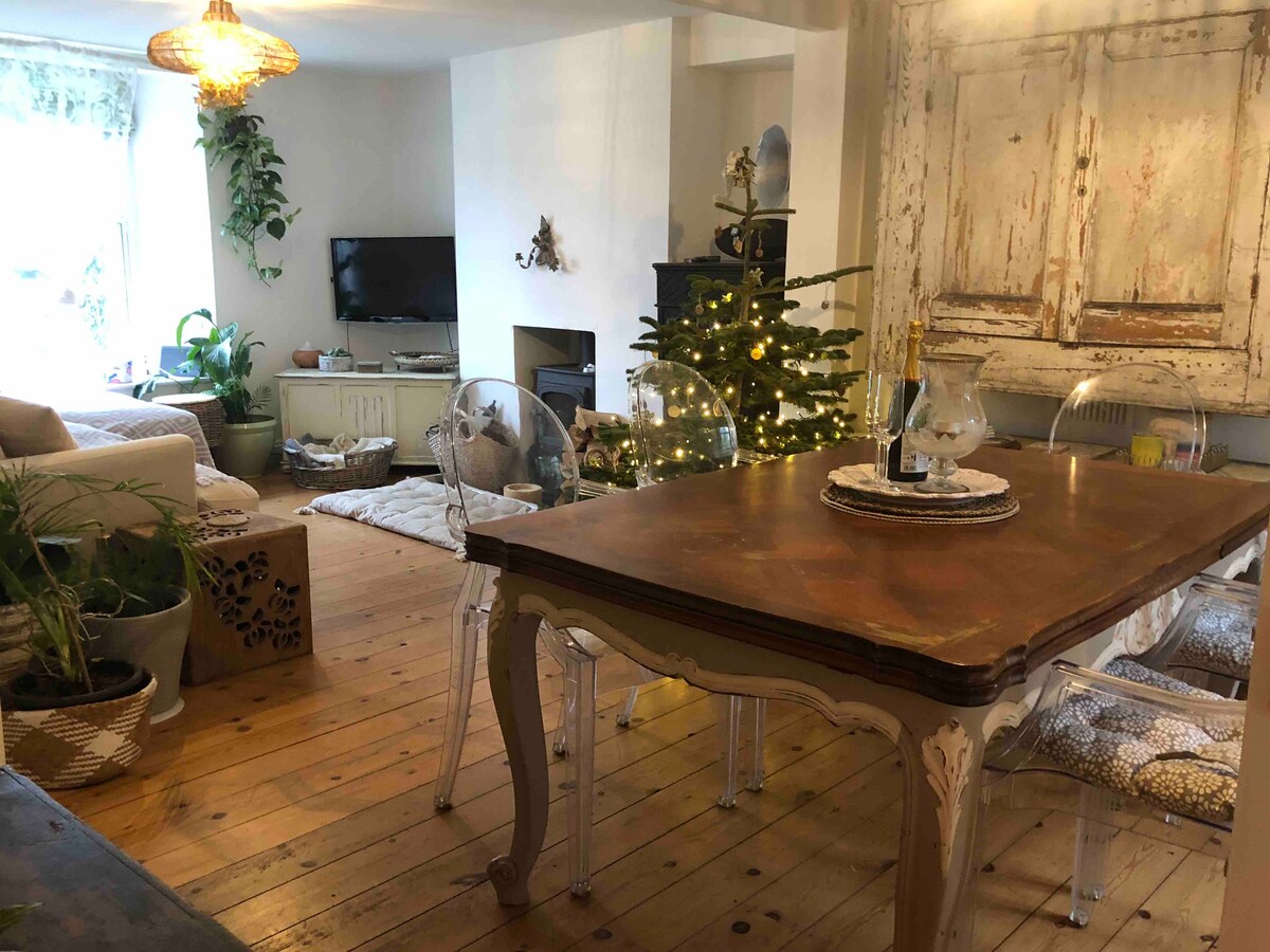 Large L-shaped open plan dining and living room with lots of original artworks. Dining table that seats 10, french doors out in to the garden, large wood-burner with ample wood supplies and L-shaped sofa. Two large comfy sofas to seat up to 8 people. Home stereo with good speakers, CD player, record player and vinyl collection. TV with Blu-ray and DVD player, Sky box and projector, and over DVDs. Overhead pull-down projector screen that becomes the fourth wall of the living room, giving you a fantastic enclosed private cinema in front of the sofas and surround sound from the speakers. More French doors leading to small rear enclosed garden.