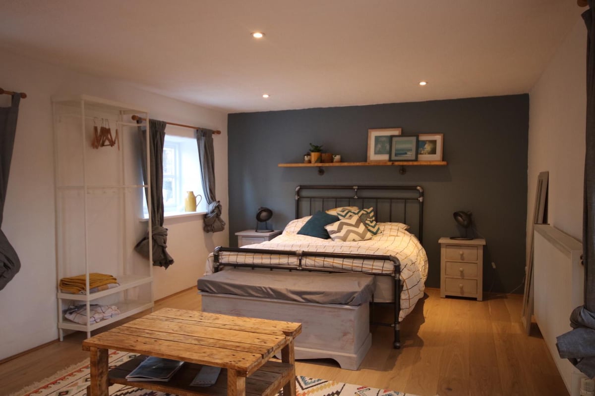 With exposed stone walls and freshly lime-rendered walls. The snug is a beautiful and cosy space, perfect for cosying up by the wood-burning stove on a stormy evening. With a desk and a double sofa bed, the snug can double up as a dedicated work space or a third bedroom.