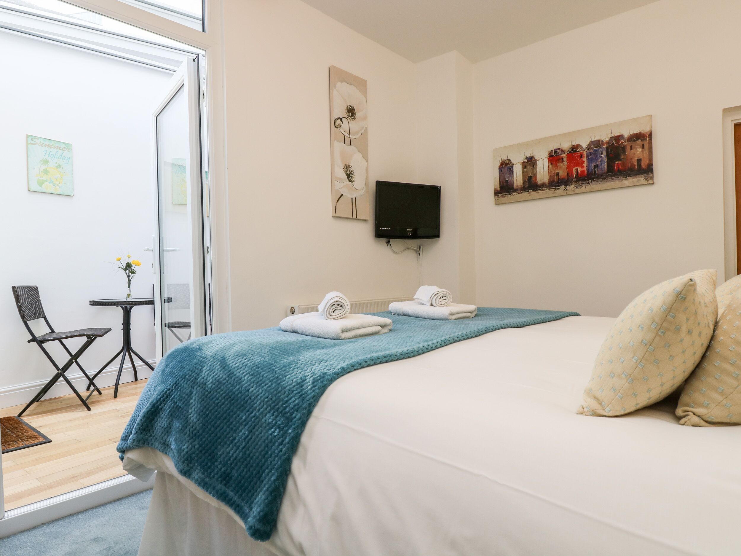 Bedroom 2. Fully carpeted with twin divan beds, white chest of drawers, bedside chest, reading lamp and vanity mirror. Door to steps leading to a small courtyard with a little seating area which catches the afternoon sun. There is a cold tap, hose and hanging area for wetsuits etc. Access to Island Square.