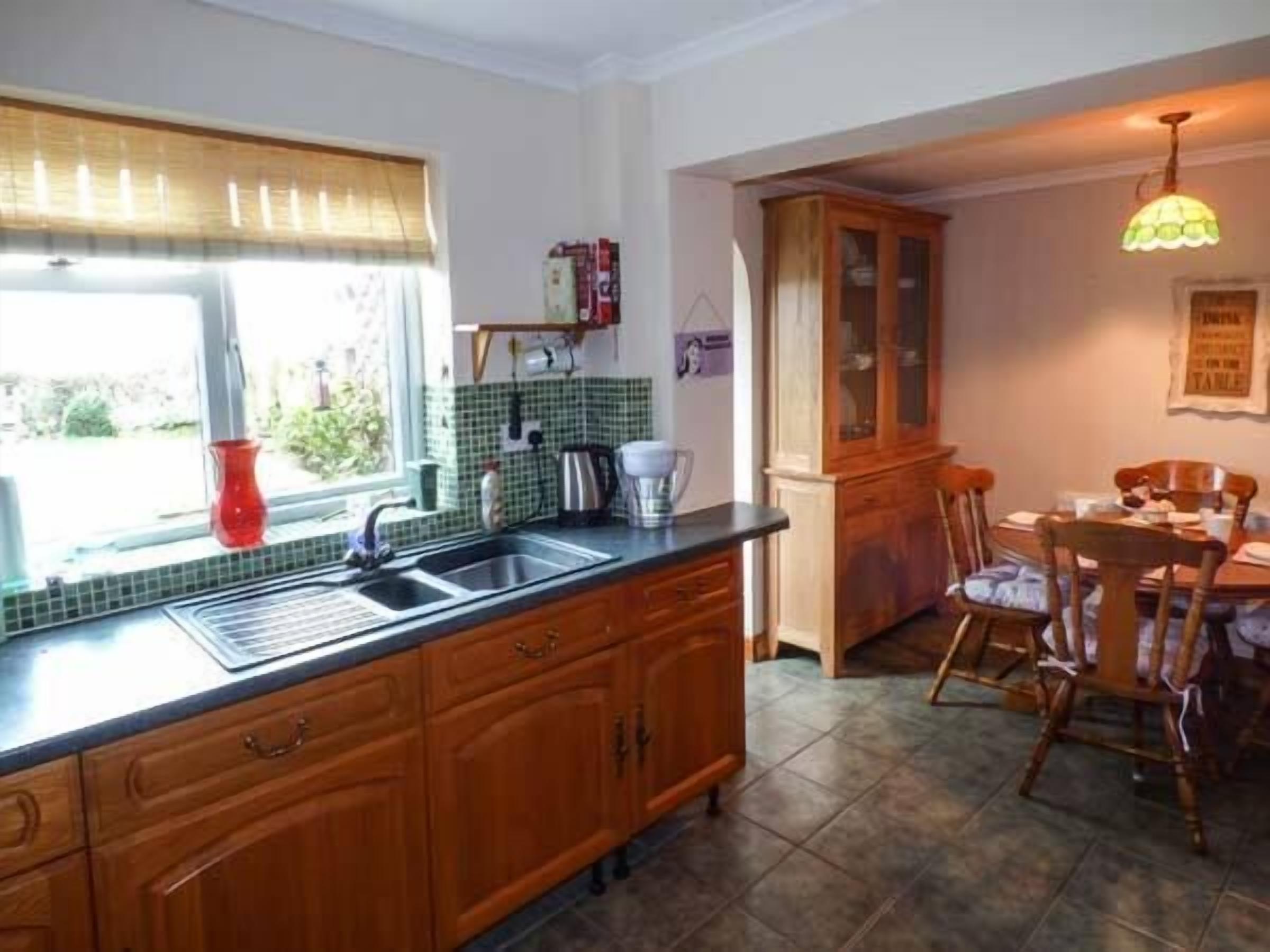 The cosy lounge has a wood burning stove, leather sofa and chair and a flat screen TV with DVD player, and a selection of DVDs. WiFi reception and speed are very good. Games, books, walking guides and maps are provided, as is wood for the fire (small extra charge). The room has a dining table and four chairs.