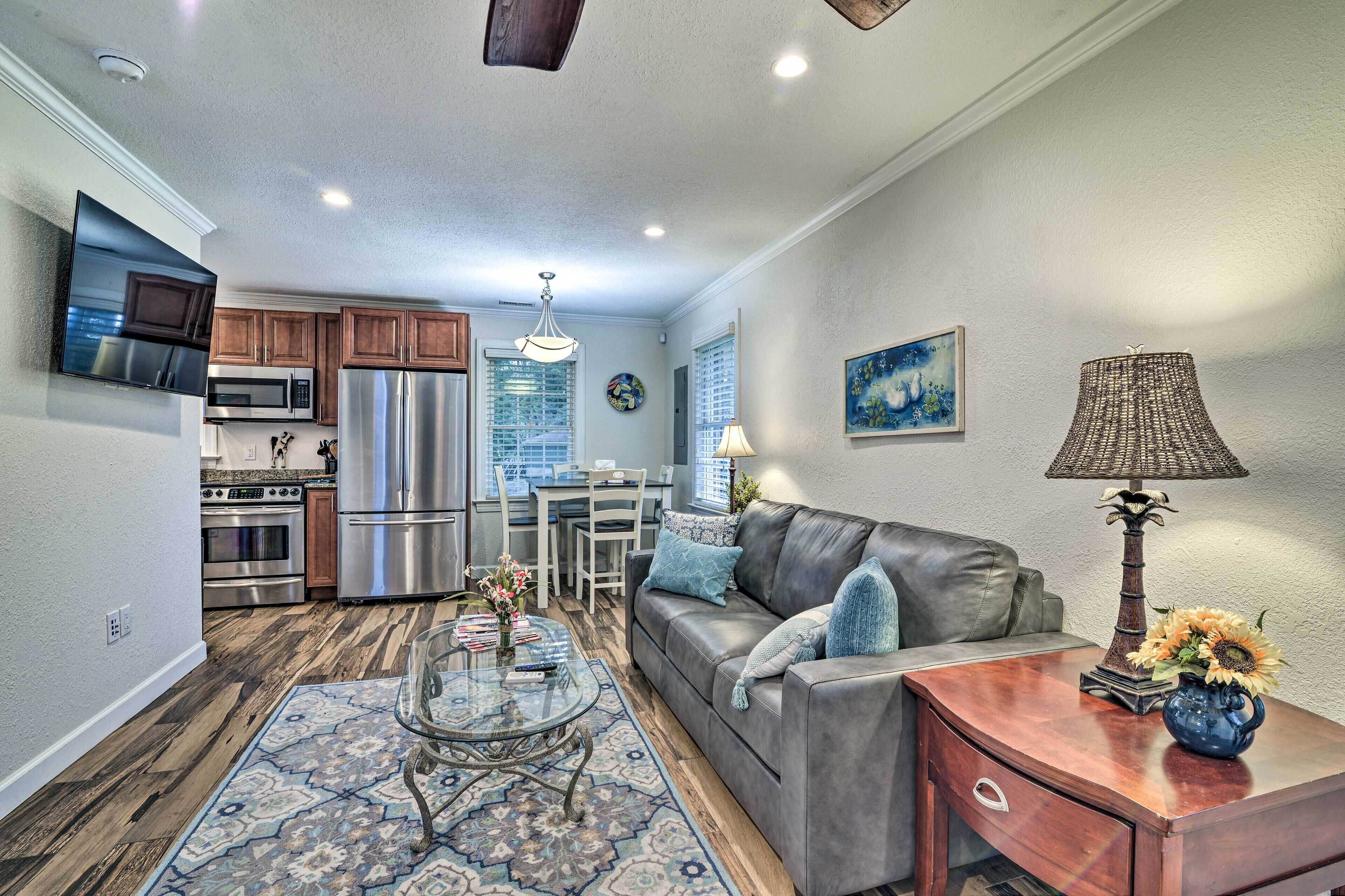 This is a very quiet and comfortable cottage with a large yard. Our home sits in the rear of the lot with lots of privacy. Good central location. The upstairs king bedroom is loft style, so please keep in mind, while you can't see up there without going to the top of the steps, there is no door to the master bedroom. The downstairs bedroom is small, but features a twin over full bunk bed. Each bedroom has a 42" smart TV. The living room has a large comfortable couch and a 55" smart TV.