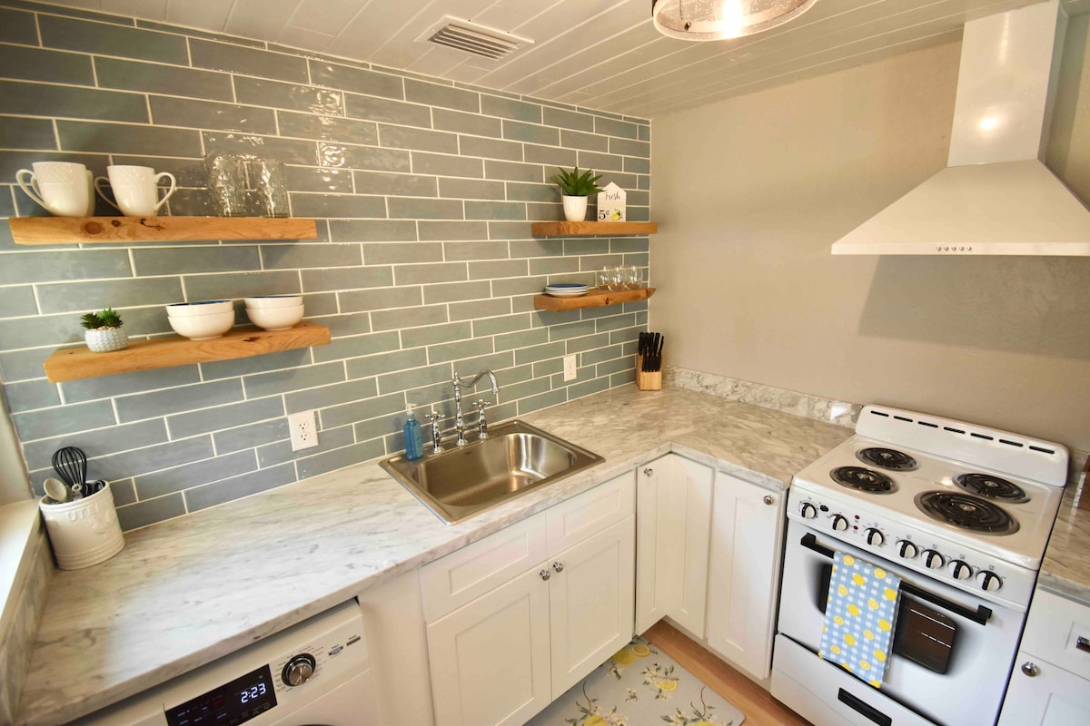 Enjoy the bright living room stocked with fun family games, like Twister, you can play near the cozy fireplace. The master bedroom with king bed has an en suite bath and walk in closet. The full kitchen has all you need from a stove/oven, microwave, dishwasher, full size fridge, coffee maker and dining room. The private laundry room has a washer and dryer. The favorite space is outdoors! Enjoy the front and back porch with classic white rocking chairs and ceiling fan. Perfect for an evening of just watching passerby’s and relaxing. The backyard includes a fire pit and lawn chairs underneath twinkling string lights.