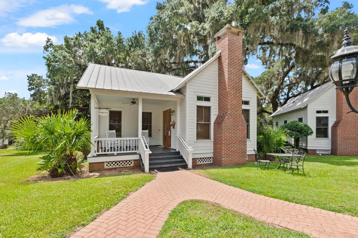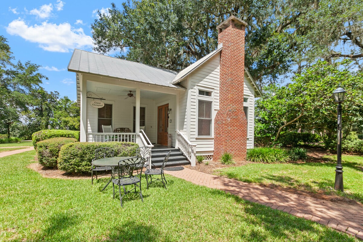Charming one bedroom guest cottage located on several acres of beautifully landscaped property. The cottage features a kitchenette with refrigerator, microwave and coffee maker. The living area contains a brick fireplace for relaxing in front of. The dining area has a round table and four chairs for evening meals or catching up on unfinished work from the day. Two rocking chairs wait for you on the private front porch for you to relax in at the end of a long day.