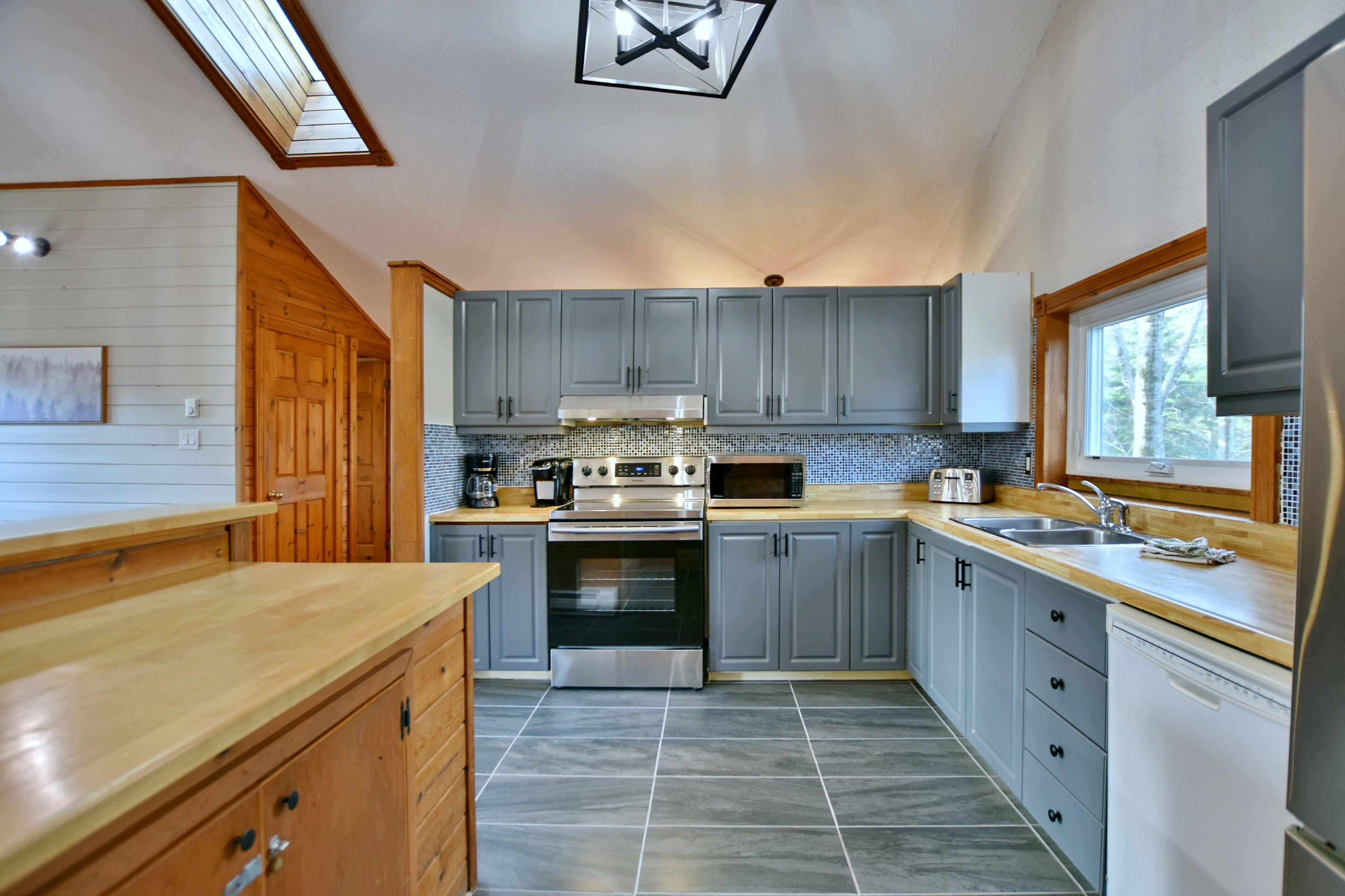 Enjoy the open concept living and dining area on the main level, with pine beamed cathedral ceiling, wood stove and slate floors. Cook simple fare to gourmet in the fully equipped granite kitchen (updated cupboards and appliances in 2024).