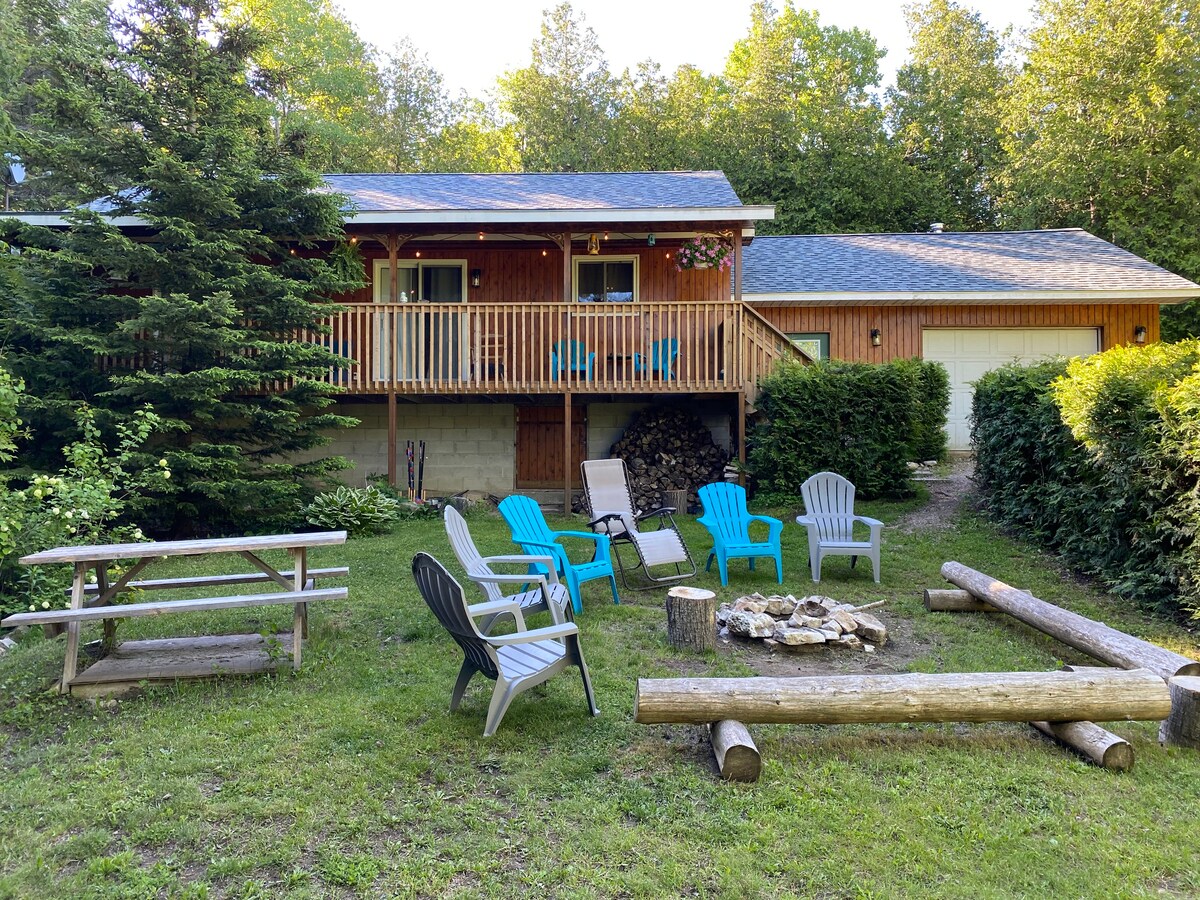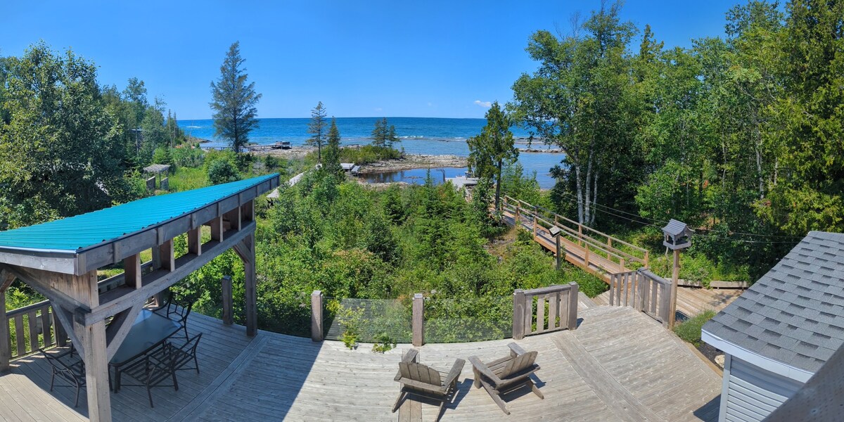 Welcome to our beautifully restored waterfront cottage on scenic Lake Huron. Enjoy a clear view of the crystal blue waters of Warner Bay from the living room, or the huge second story deck. The original cottage was built in the 1970s and we were lucky to purchase it in 2009 from the first owners. In 2018 we made the leap into a full renovation to expand the capacity and make it super family friendly. We tastefully finished the interior with natural wood trim, solid wood doors, and ample natural light. You can relax in the same comfort of a modern home with the upgraded electrical, water filtration system, new plumbing, clean and modern bathrooms, and safety with CO and smoke alarms per modern building codes. This place has the charm of a waterfront cottage, but the peace of mind of a brand new home. On calm days the bay is amazing for canoeing, kayaking, paddle-boarding and swimming. The shoreline is rocky and does require some attention until you reach the smoother part of the lakebed. It’s shallow for quite a while and the clarity is stunning on calm days. Some type of water shoe or sandal is recommended. Enjoy an open fire by the shore or relax on the deck and listen to the water lapping against the rocks. Tobermory is less than 10 minutes by car and close enough to cycle for those wanting some exercise.