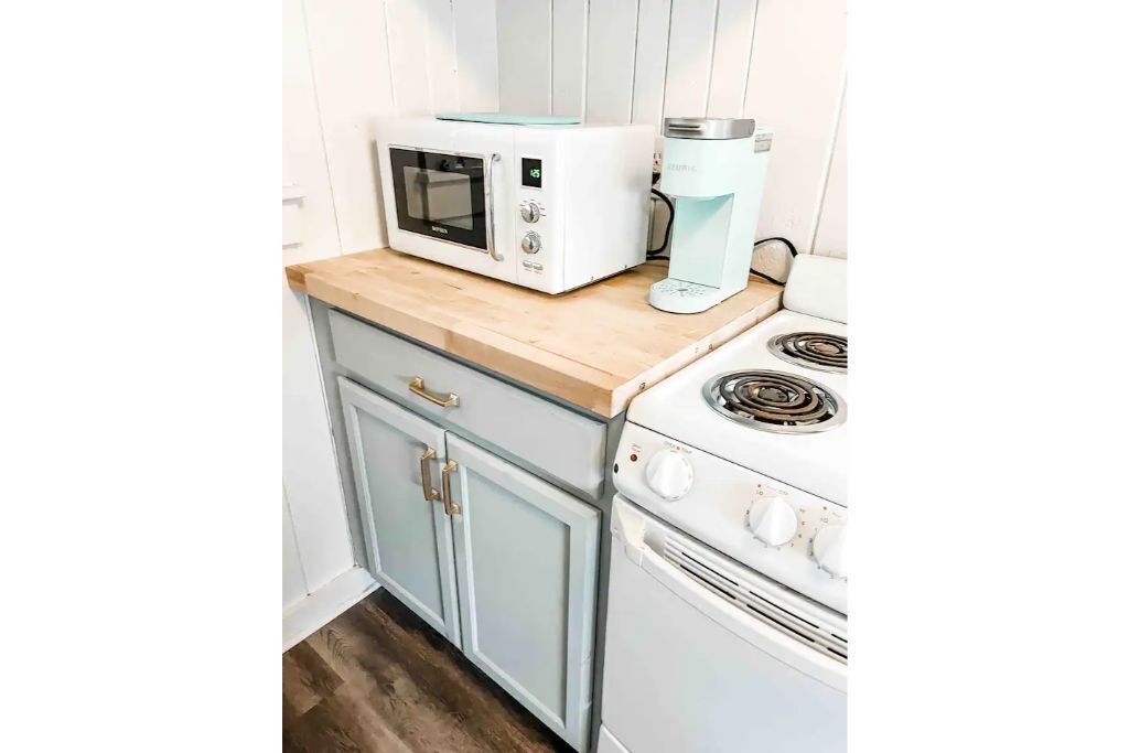 Appliances include a stove, microwave, refrigerator, and Keurig machine. Cabinets are stocked with dishes, glasses, utensils and pots and pans. The glass tabletop seats four, and can double as a workspace.