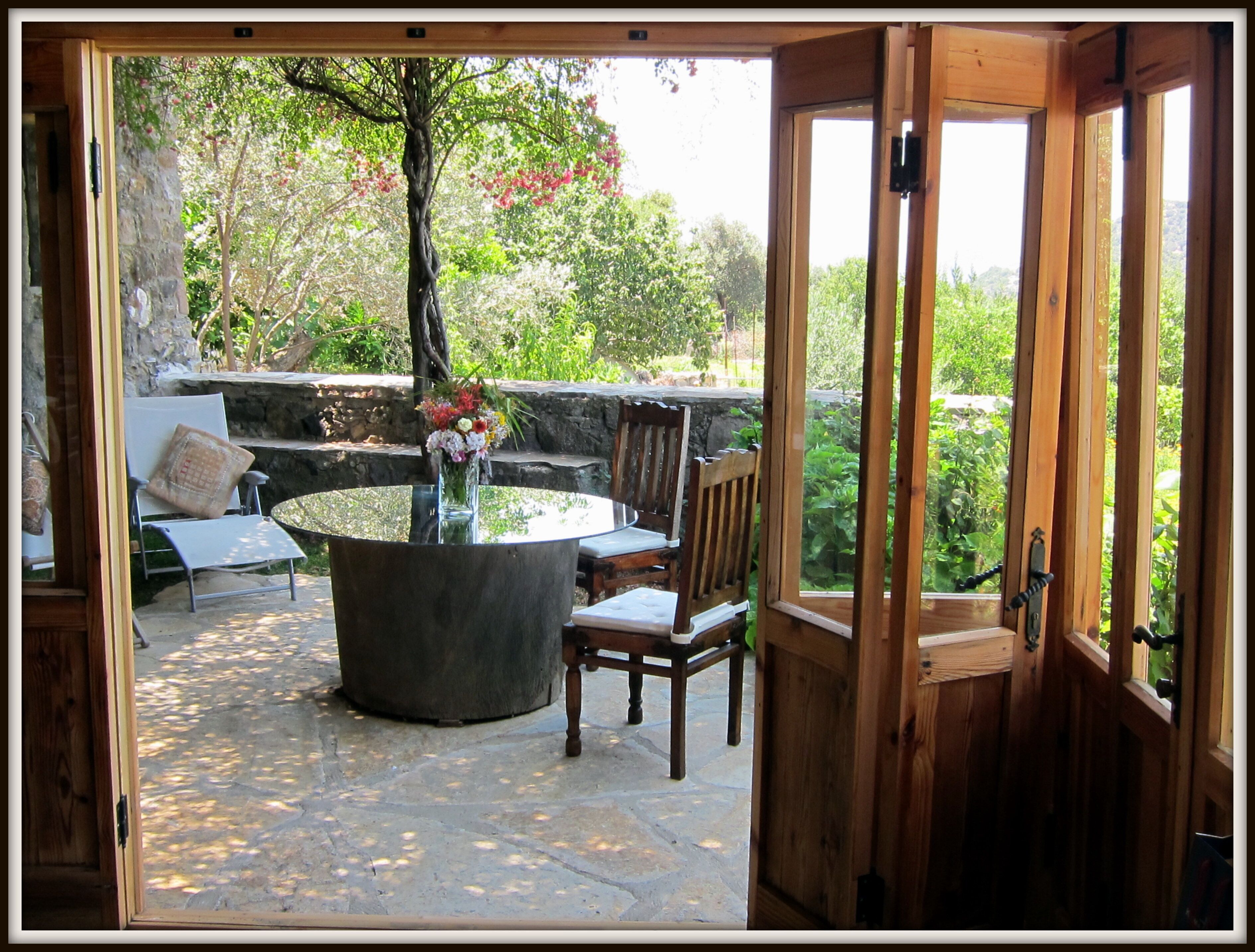The Iassus residence is quite private. One enters the residence via an antique, Bodrum, pine carved door, from the extensive stone patio surrounding the house. Through this door, one enters the pinewood/glass room. This room is made from recycled, accordion-style, pinewood doors mounted with clear glass in the upper half of each door. Great light in this room.