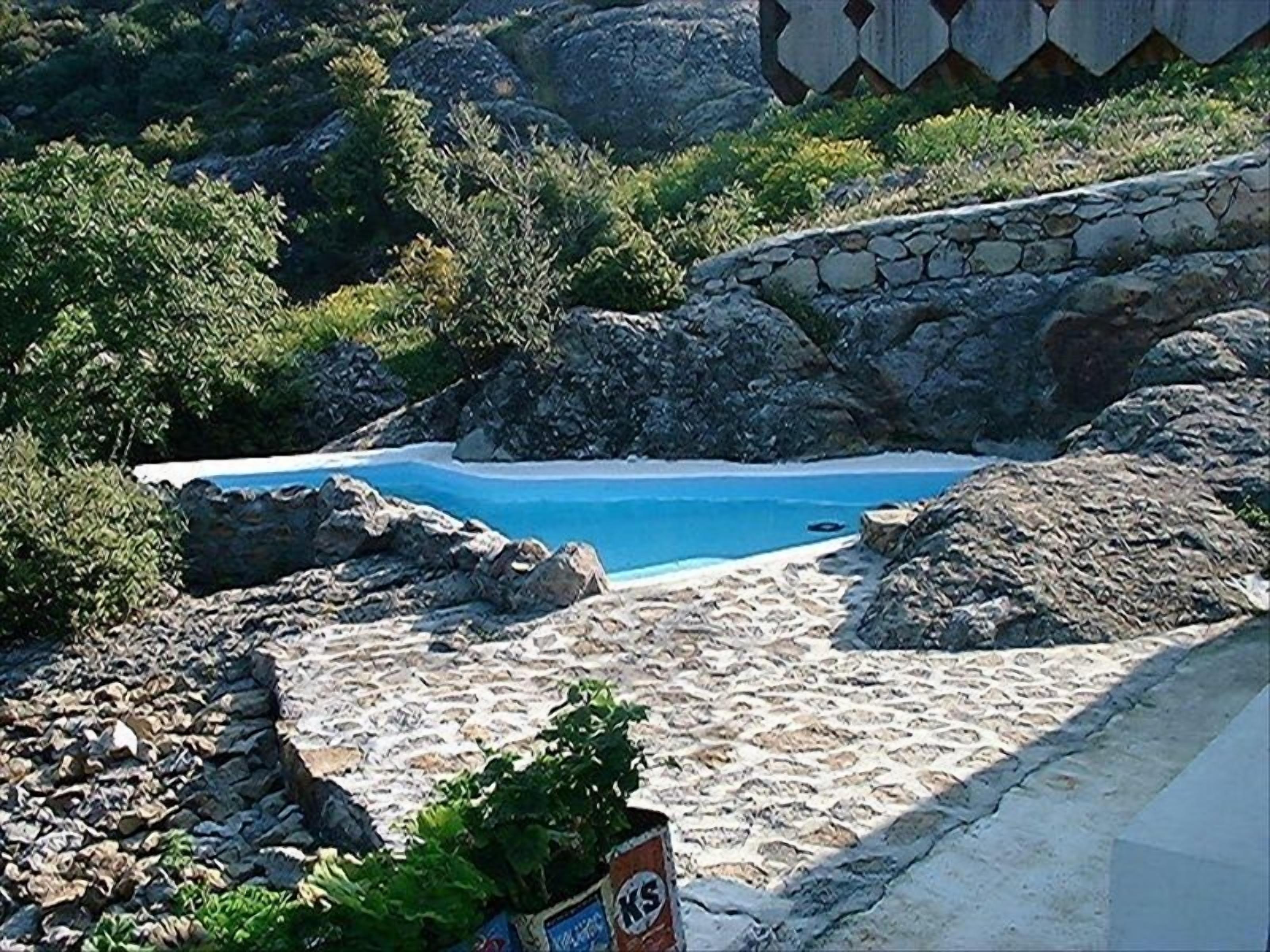 The small pool has been cut out of natural rock. It is not for swimming but perfect to simply cool off during the day or watch the sunset. It is shallow on one side and deeper on the other, facing West, where the sun sets. There are 2 adjustable deck chairs and an umbrella. The pool is hidden from view from neighbors as they are all below this house.