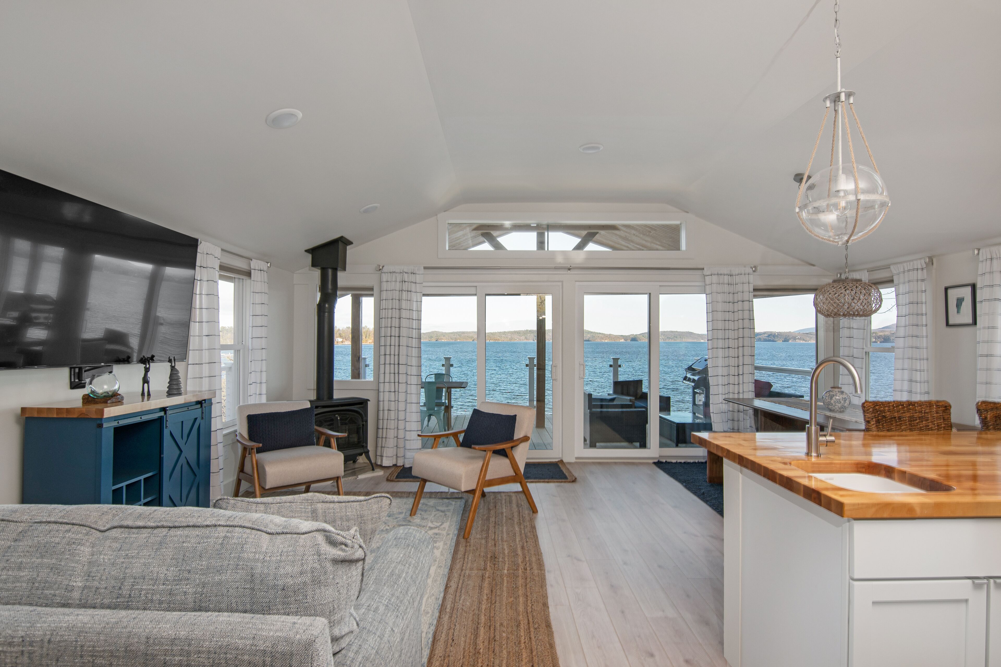 The waterfront deck has a grill, dining table and umbrella, and an outdoor sofa and coffee table.