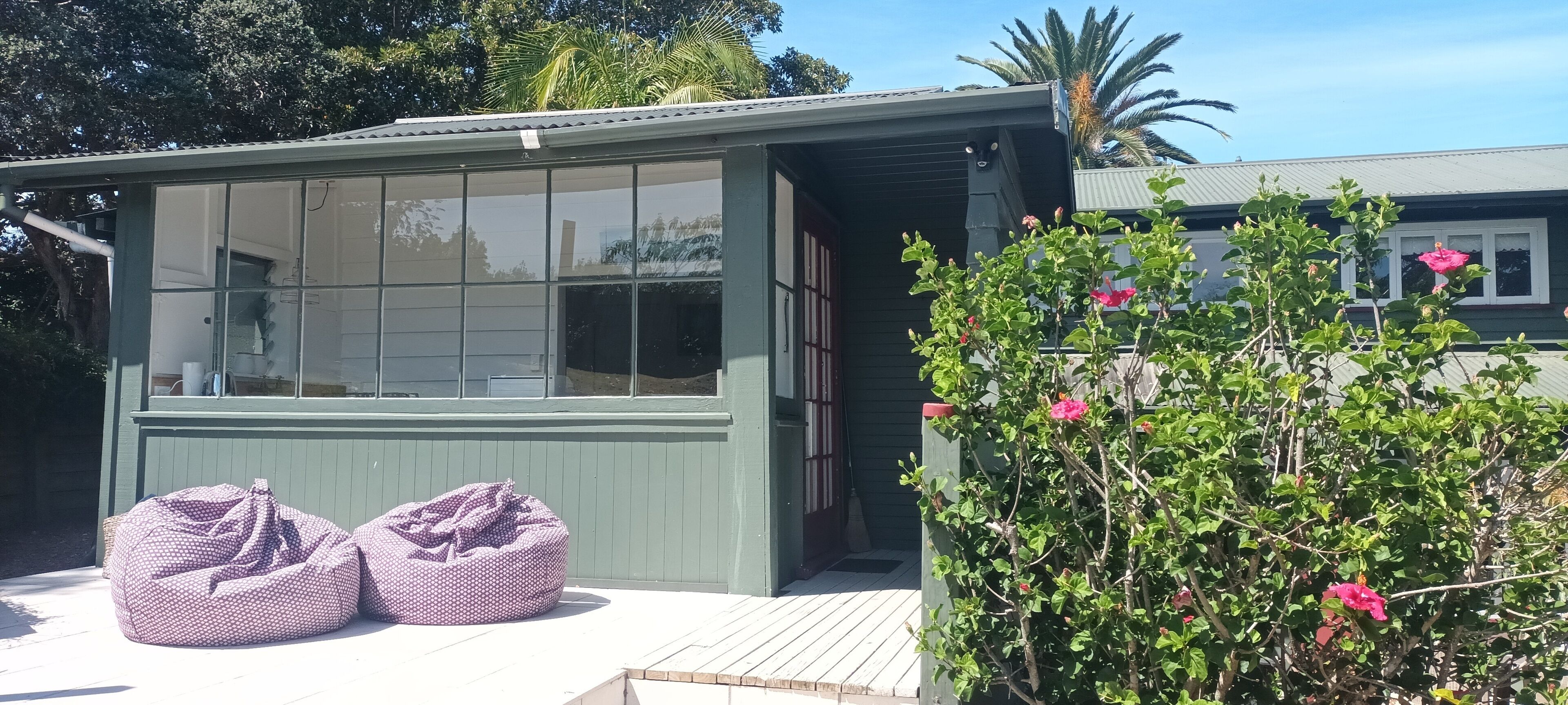 This cute bach has recently been renovated for comfort with an authentic twist. The house is ready for a wonderful holiday on stunning Waiheke Island. It has wrap around decks, with large, covered areas, so you can use the bbq anytime. Relax in mid-century style, mixed with contemporary highlights. Curl up on the couch and enjoy the eclectic book collection. Wander down the road to the famous Ostend market on Saturday mornings, walk the new Te Ara Hura walkway which goes straight past the bach, or enjoy some of the neighbourhood cafes. Bring or rent a car or bike for the short trip to any of the beautiful beaches - Palm Beach is only 5 minutes away by car.