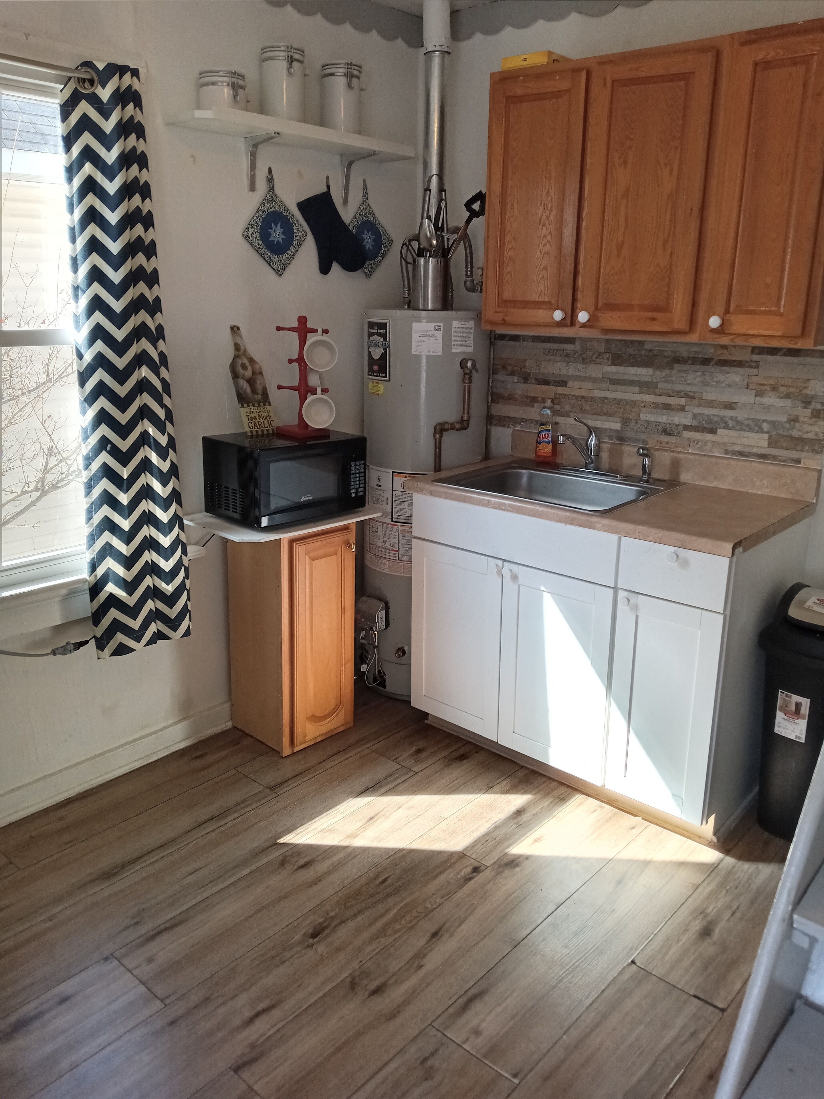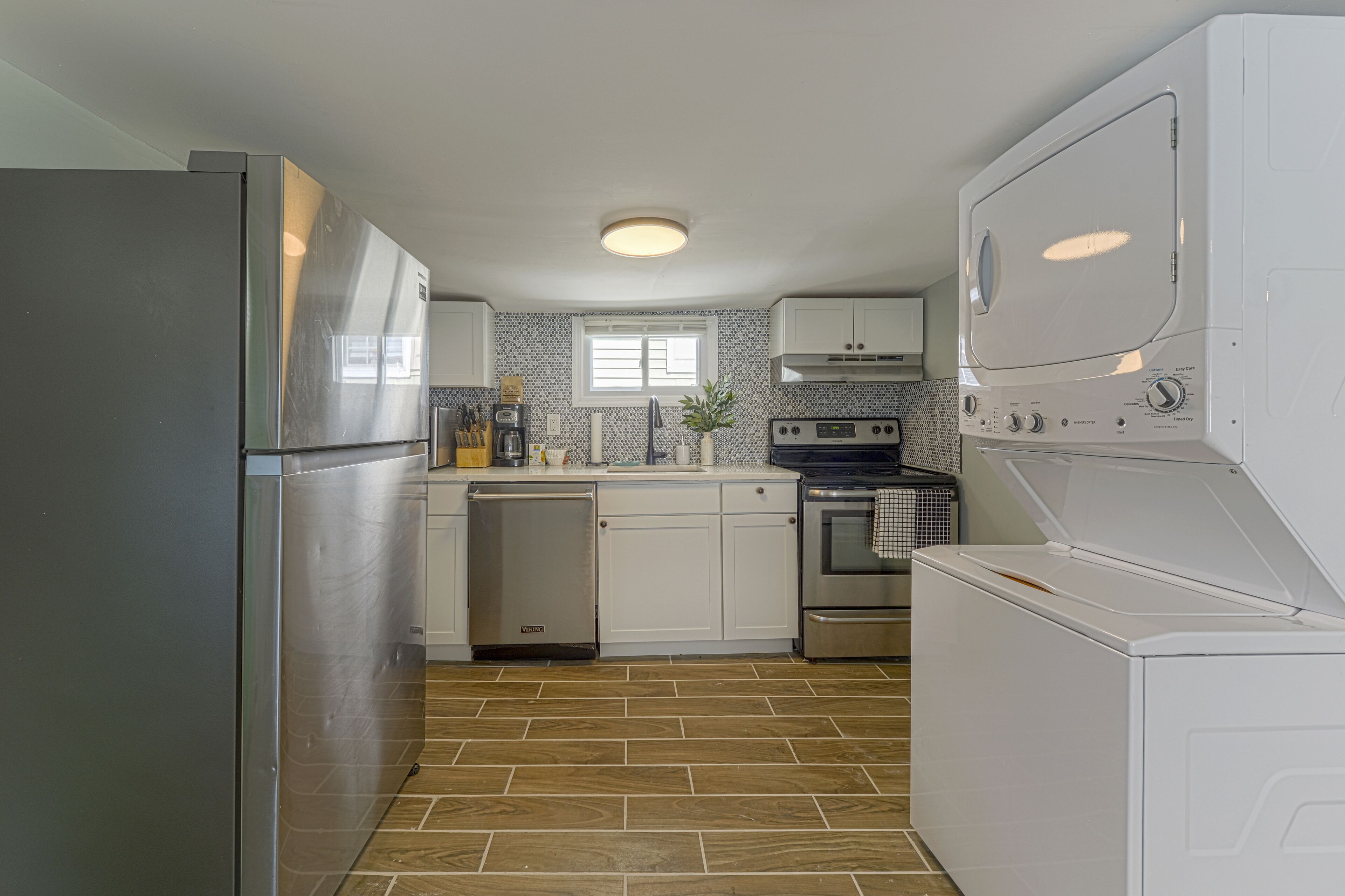 Fully equipped kitchen with electric range/oven, microwave, coffee maker, toaster, and all the kitchenware you will need. A/C and heat make this a perfect year round getaway! Free parking for 2 cars.