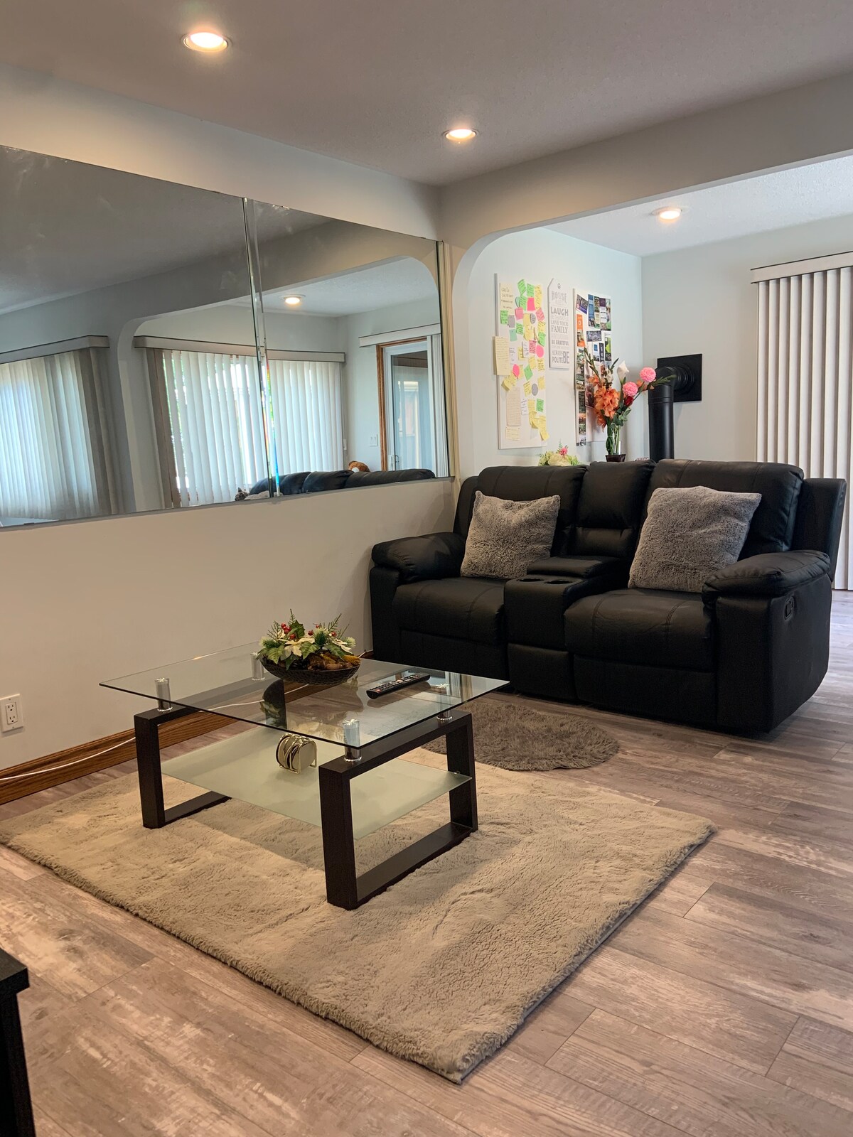 Basement movie room with snack bar, including air popper popcorn maker and fridge. Pull out couch perfect for snuggling while watching a movie on the 65" smart TV or one of our 300+ DVDs!