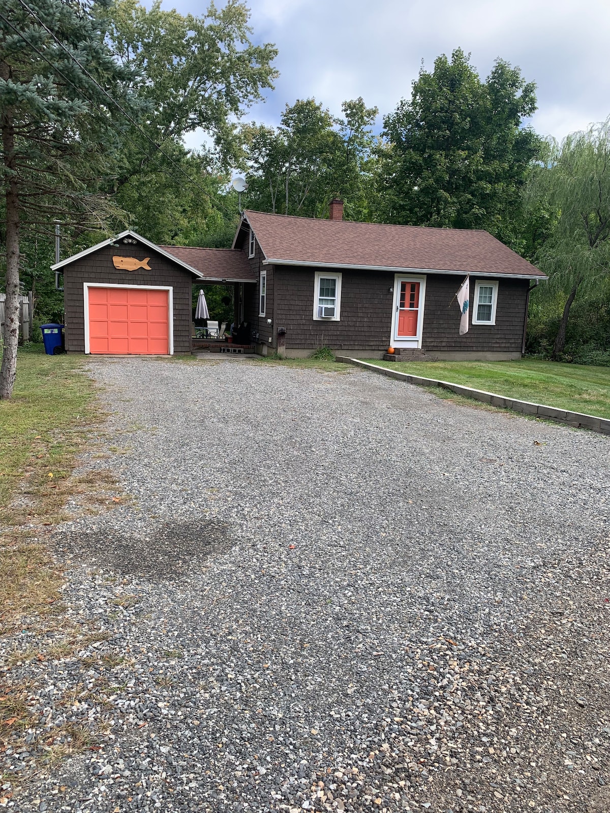 There’s a grass yard with a gas grill, picnic table and a fire pit. There’s parking along side the cottage for 2 cars.