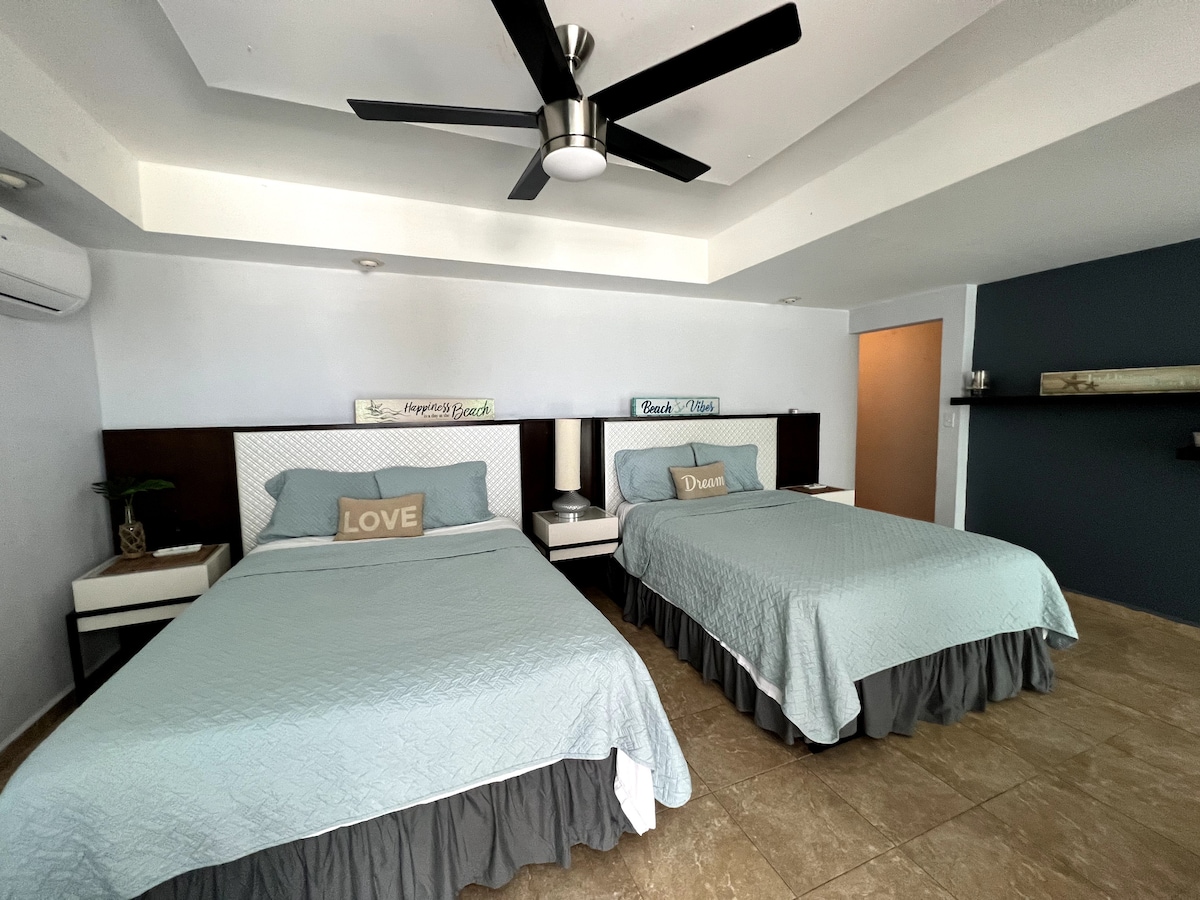 The bedroom has two full size beds, bathroom, smart TV, refrigerator, coffee maker, microwave and a private balcony inside the room to enjoy the sea breeze and overlooking the pool. We provide linens, towels and some bathroom essentials such as bar bar, shampoo and conditioner.