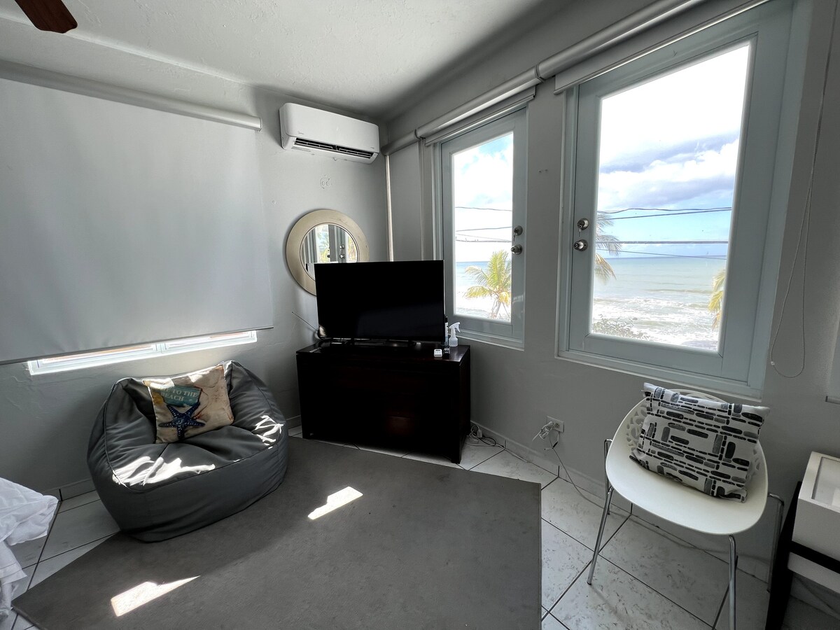 This cozy bedroom has everything you need, including a beautiful view of the ocean right outside your window. This space includes a queen bed, private bathroom and shower, AC, Wifi, and an Apple TV. There is a private pool downstairs open to all hotel guests. This beachfront property is located on Pico de Piedra in Aguada and is just walking distance from several bars and restaurants.