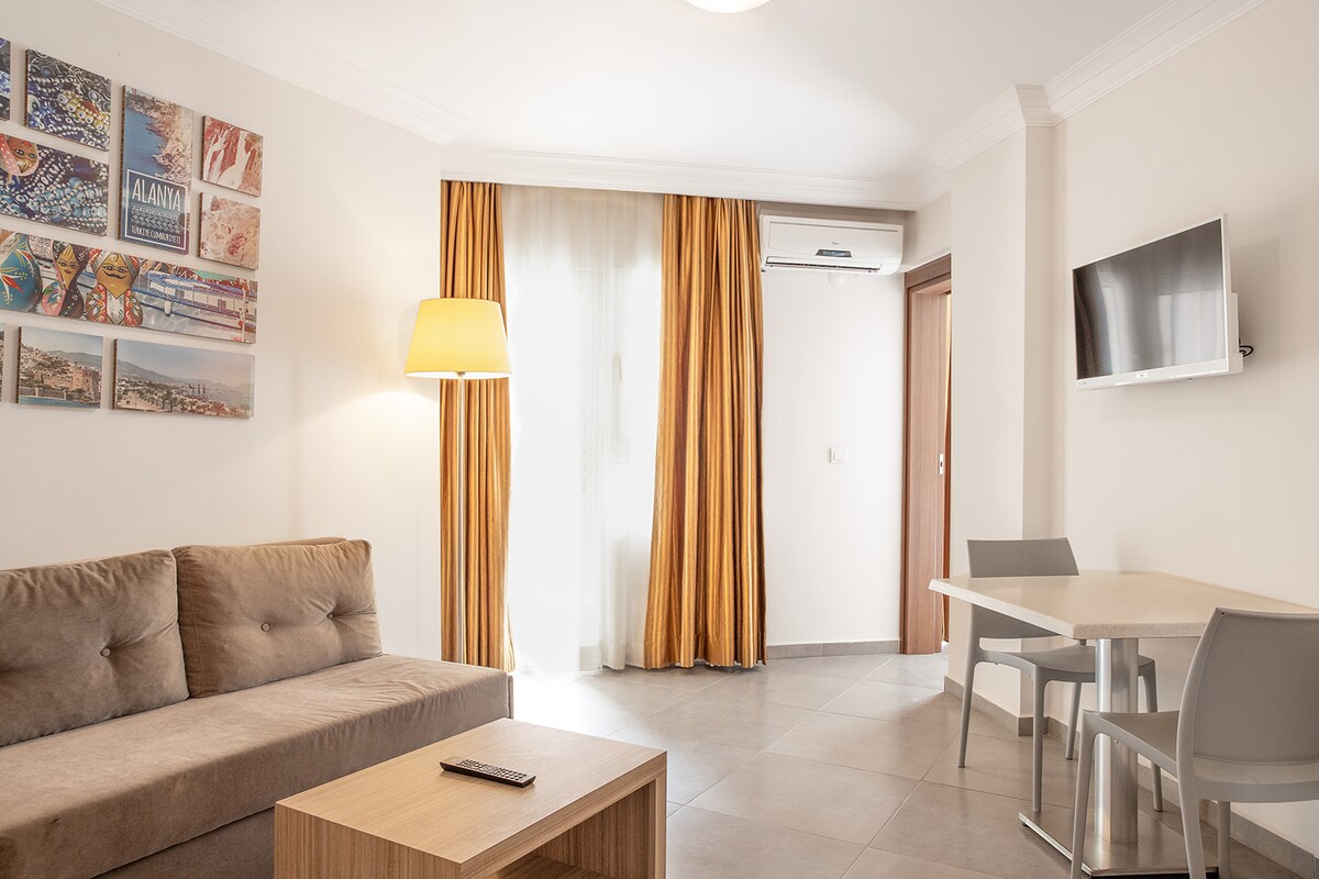 Luxury apartments for short and long term rent in Alanya region, in a location with wonderful view of the majestic Kleopatra beach. Kleopatra Tuna Apart Hotel is 50 meters from the beach and 3 km from the city center. Our 2+1 rooms are 75 m2 with a kitchenette. You are provided with everything you need for a simple cooking such as kettle, mini fridge, cooker, toaster, microwave, coffee machine,... Or you can enjoy our a la carte restaurant. Every room has a balcony and private bathroom.