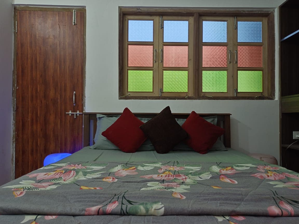 This room exudes a tropical, relaxing vibe with its minimalist yet chic design. The centerpiece is a queen-sized bed, adorned with floral-patterned bedding and a soft teal headboard featuring artistic palm tree accents. Natural light filters through bold teal curtains, creating a cozy ambiance. A hanging bedside lamp adds a warm glow, while a compact desk corner offers convenience. The air-conditioned space invites you to unwind after a day of exploring Anjuna’s beaches and vibrant culture.