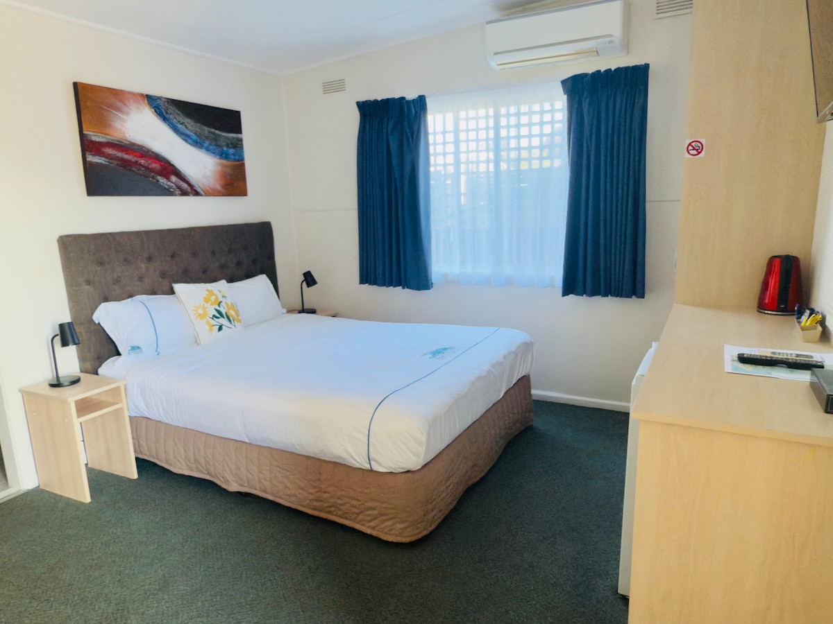 Clean & comfortable motel room with queen size bed including TV, table & chairs, heating, air-conditioning, ceiling fan, small fridge, toaster, kettle, tea & coffee plus small ensuite bathroom. Free parking, Free WIFI, NO- SMOKING, ground Floor, MAX 2 persons including children