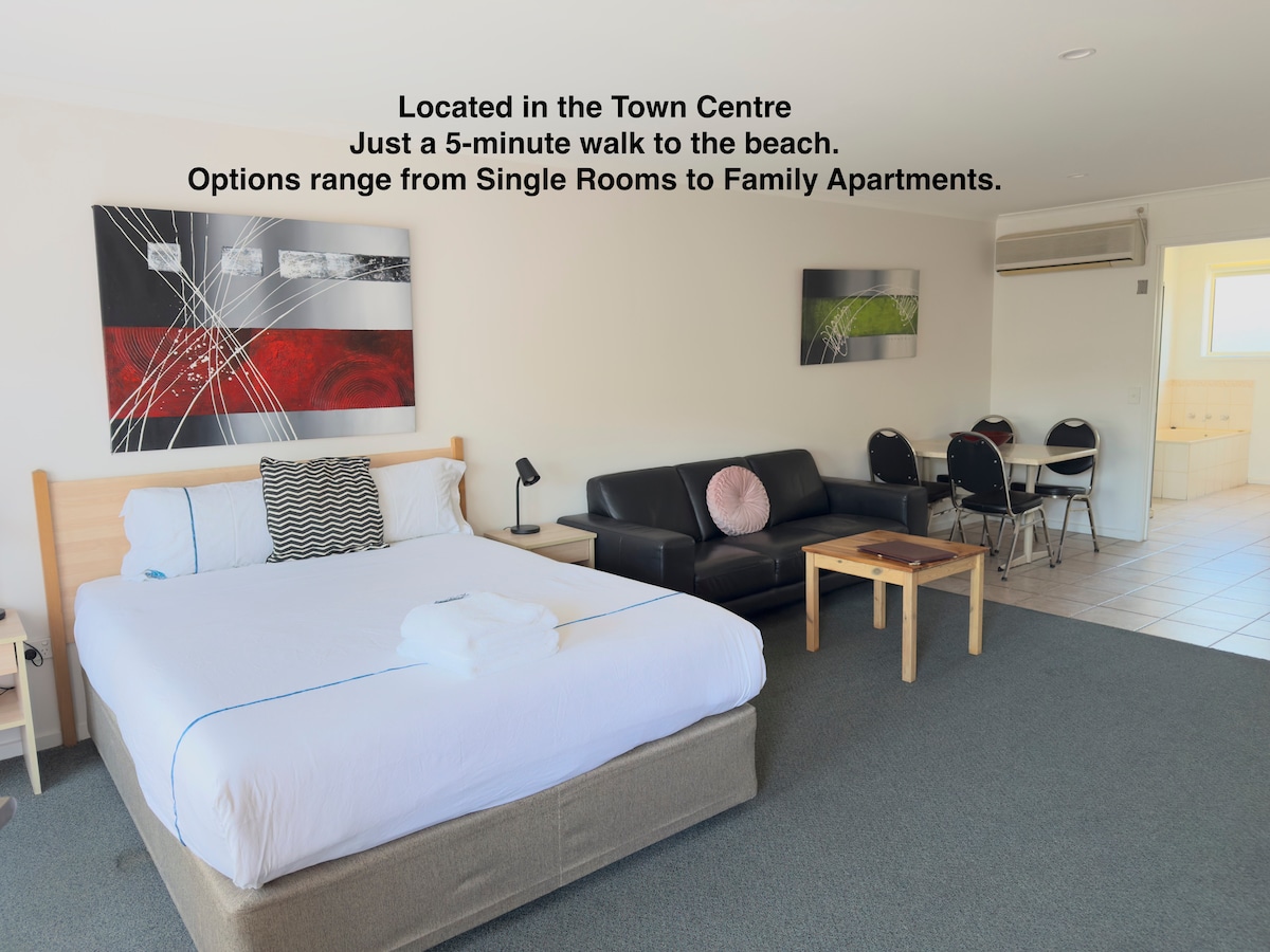 - "Didn’t like: parking whilst very convenient was tight to reverse out of. Liked: everything was great. Shower and shower products were eco friendly. Would have appreciated an extra bin in the kitchen and perhaps a recycle bin as we stayed two nights. " - "Excellent location across from the beach and 50 meters to shops. Bed was comfy and room very comfortable" - "Great size room and layout with kitchette in its own little alcove " - "It was a comfortable and clean stop over on our holiday. Friendly and helpful at reception. Shower was great! Thank you."