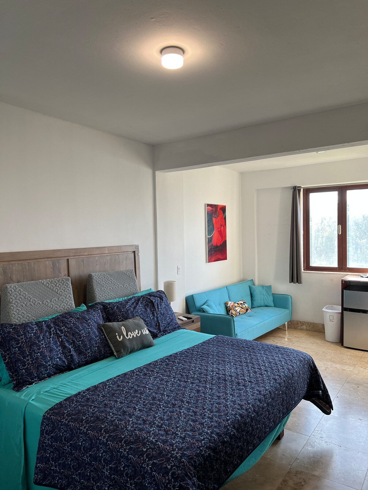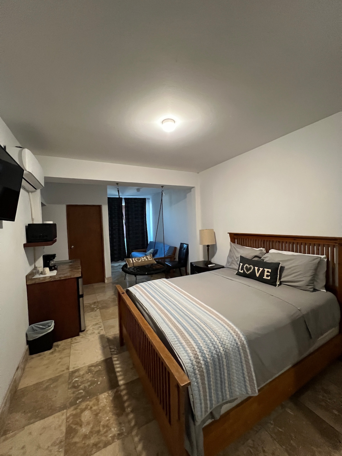 This family studio has two full size beds, a loveseat and dinette table, TV, AC, a separate kitchen with basic kitchen utensils and equipment, a private bathroom. What makes this special is the location within the property, as the pool is right next to the room. There is an amazing pool and ocean view right by the door.