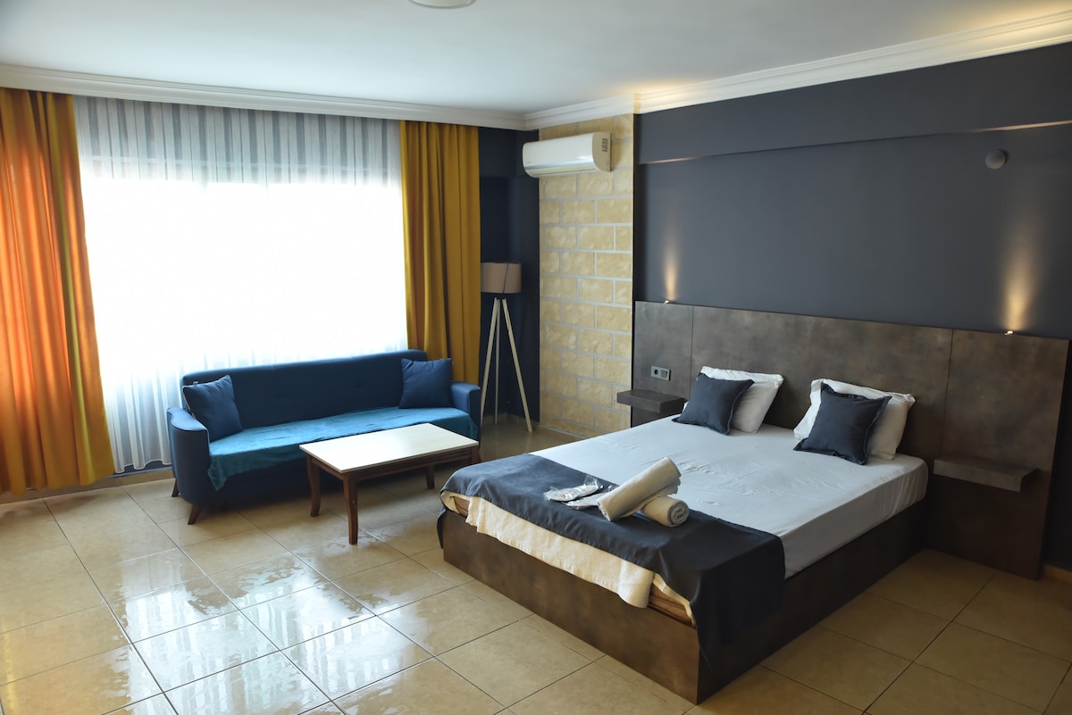 Relax in our 1+1 room for a comfortable stay. Equipped with basic necessities such as bathroom, towels, hair dryer and washing machine, TV, air conditioning, refrigerator, kitchen and kitchenware. We offer an ideal accommodation with 1 double bed and sofa set.