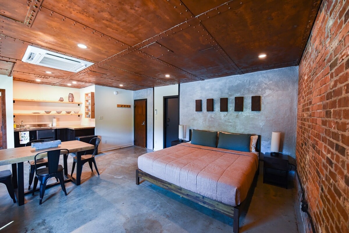 Elevation Lofts Hotel is perched on the third floor and upper mezzanine levels of a historic building that was completely renovated in 2021, and its apartment-style units are all fully furnished for your comfort and enjoyment. Samsel Architects in Asheville designed each unit with a unique floorplan, and their vision was executed flawlessly by Falcon Construction, and then complemented with individual décor selected by Alchemy Design Studio in Asheville