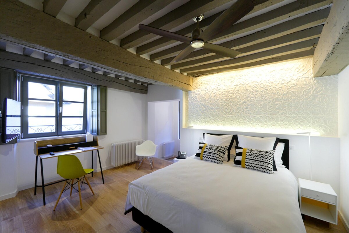 Studio room No. 4 located on the second floor in the attic by the Creuse river. It is decorated in a contemporary style and furnished with designer furniture. The floor is oak parquet. It includes a kitchenette (fully equipped with a dishwasher, oven, fridge, dishes, etc. ), a NESPRESSO machine, a storage wardrobe, a desk, a dining table, and 2 armchairs, a double bed (160 cm), and a 32-inch smart TV that also allows you to listen to the radio.