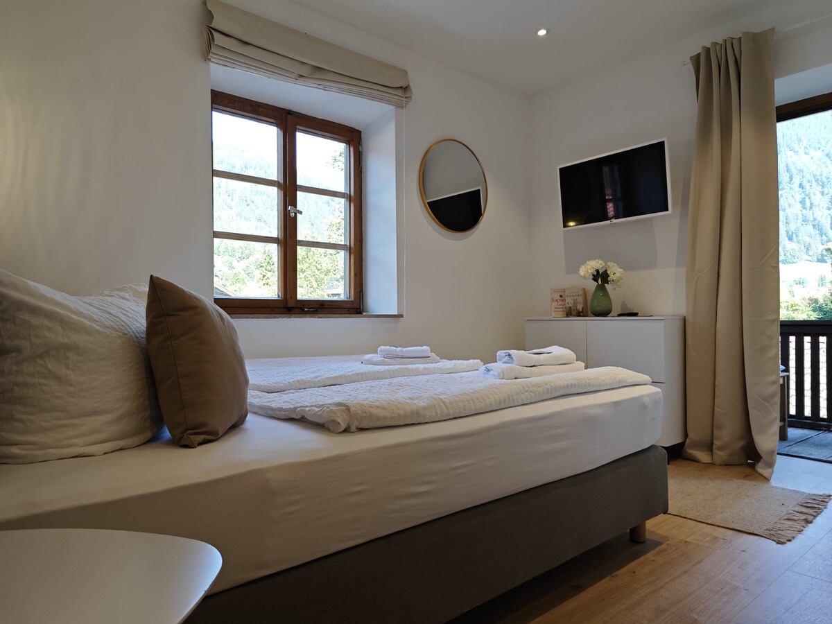 Our average comfort double room, with access to the balcony, and include a spacious living with a direct view to the mountains. All these rooms are equipped with shower and toilet. In addition to a seating area with table, the rooms are equipped with TV and wardrobe.