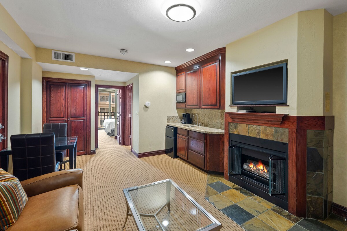 On your next trip to the mountains, stay within walking distance to the chairlift by cozying up in our beautiful over-sized suite! Perfect for a romantic getaway, our elegant mountain retreat features slopeside access and a lovely fireplace. Additional features we think you’ll love include: