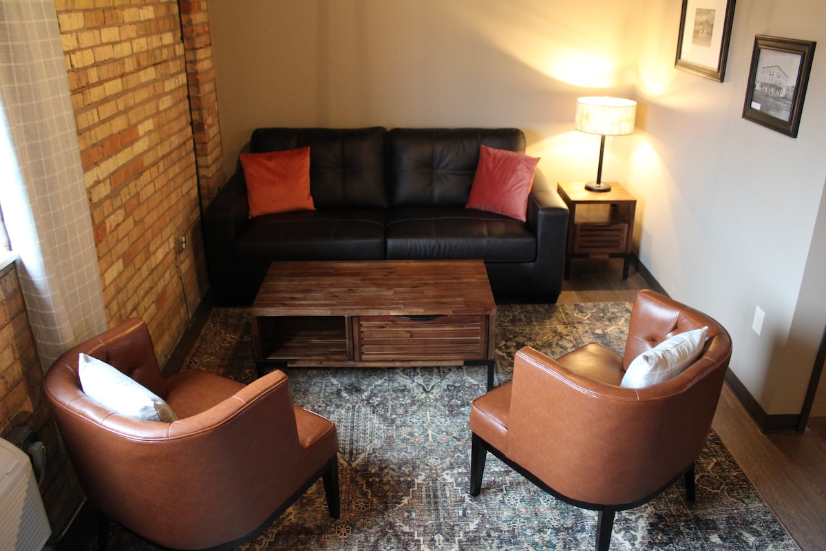 The Markham features 2 queen beds and queen pullout sofa combined with a comfortable seating area and fridge-microwave-coffee maker station for enjoying your stay. The 4th Street Loft’s most spacious unit, it is located in the northwest corner of the building above the Blue Oyster restaurant.