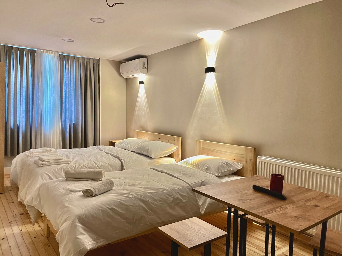 We would be happy to welcome you in our suite with a balcony on the ground floor of our facility, which has a 24/7 reception. It is located 3 minutes from Galatasaray high school on Istiklal street. 2 minutes walk to the bus station and 15 minutes to the metro stops. You can have breakfast in our hotel at your request with our affordable breakfast menu. Our rooms have Wi-Fi, air conditioning and central heating.
