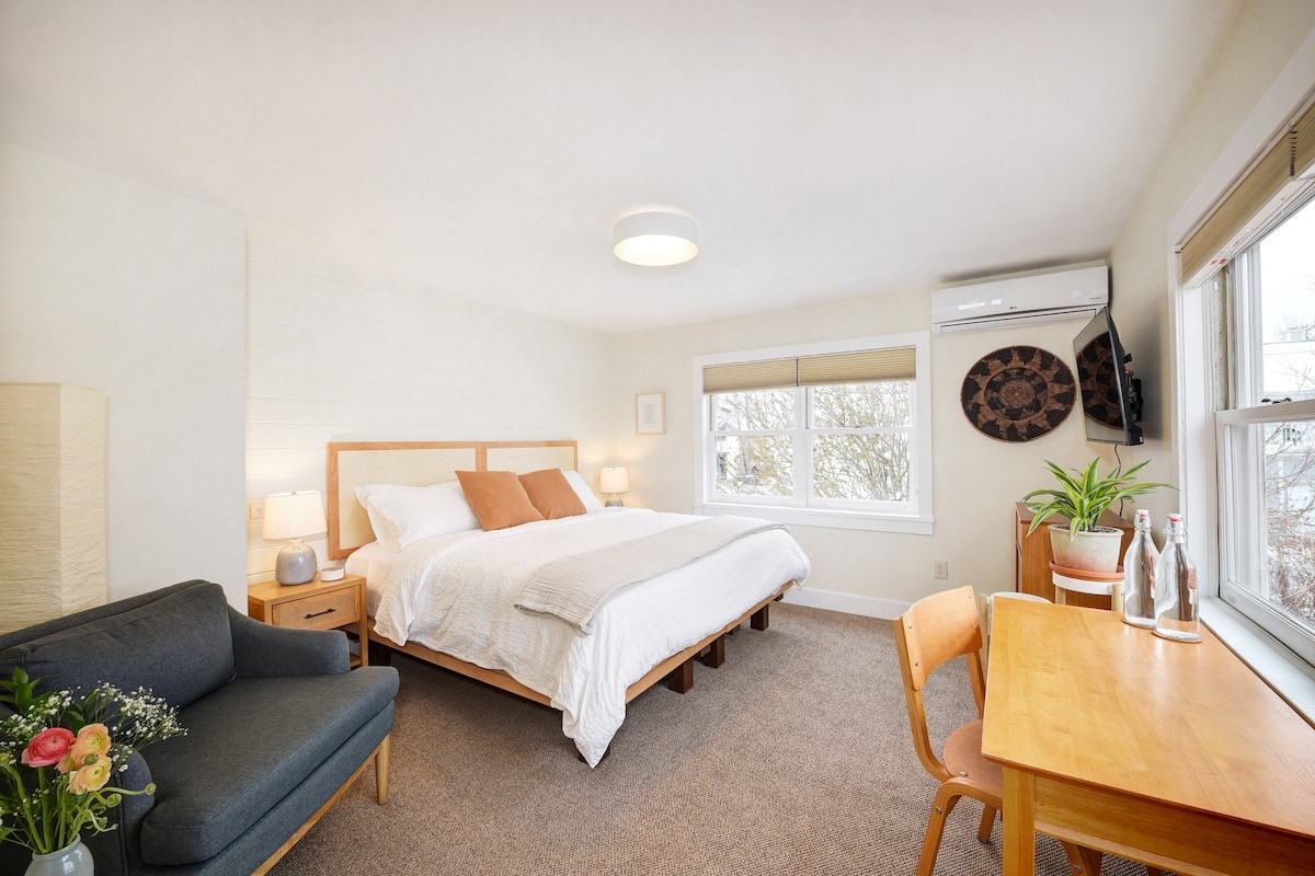 Main House #3 is a cozy and cheerful room, which features a custom-designed locally made King bed, a bathtub, a full closet, desk, and a private exterior entrance through the back garden. This room sleeps 1-2 guests.