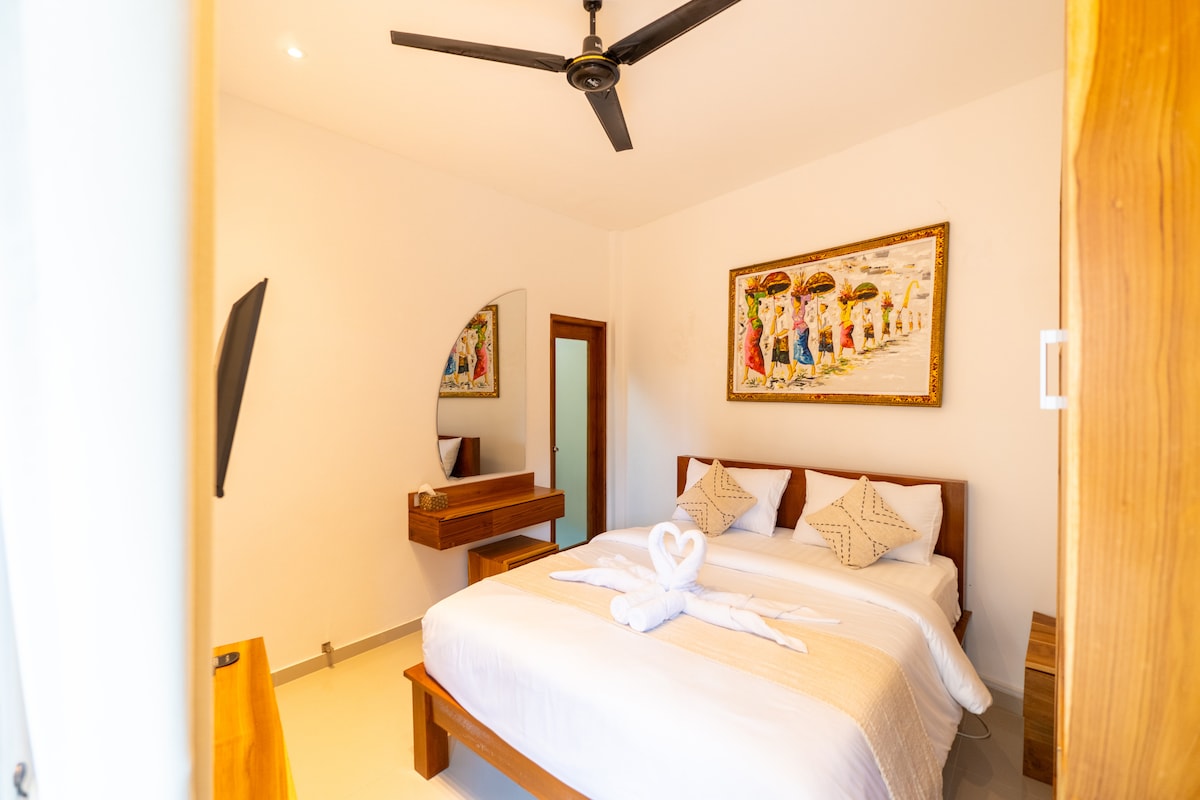 Immerse yourself in traditional design and comfort, complete with fresh linens and towels, A/C, and comfortable beds for a perfect night's sleep. Each room includes a cabinet and towel rack, as well as a private outdoor seating area for relaxation. Take a quick two-minute walk to the beach, where you can catch sight of playful dolphins, or dine at the delicious nearby restaurants and Warungs. Don't miss out on nearby attractions like breathtaking waterfalls and stunning temples.