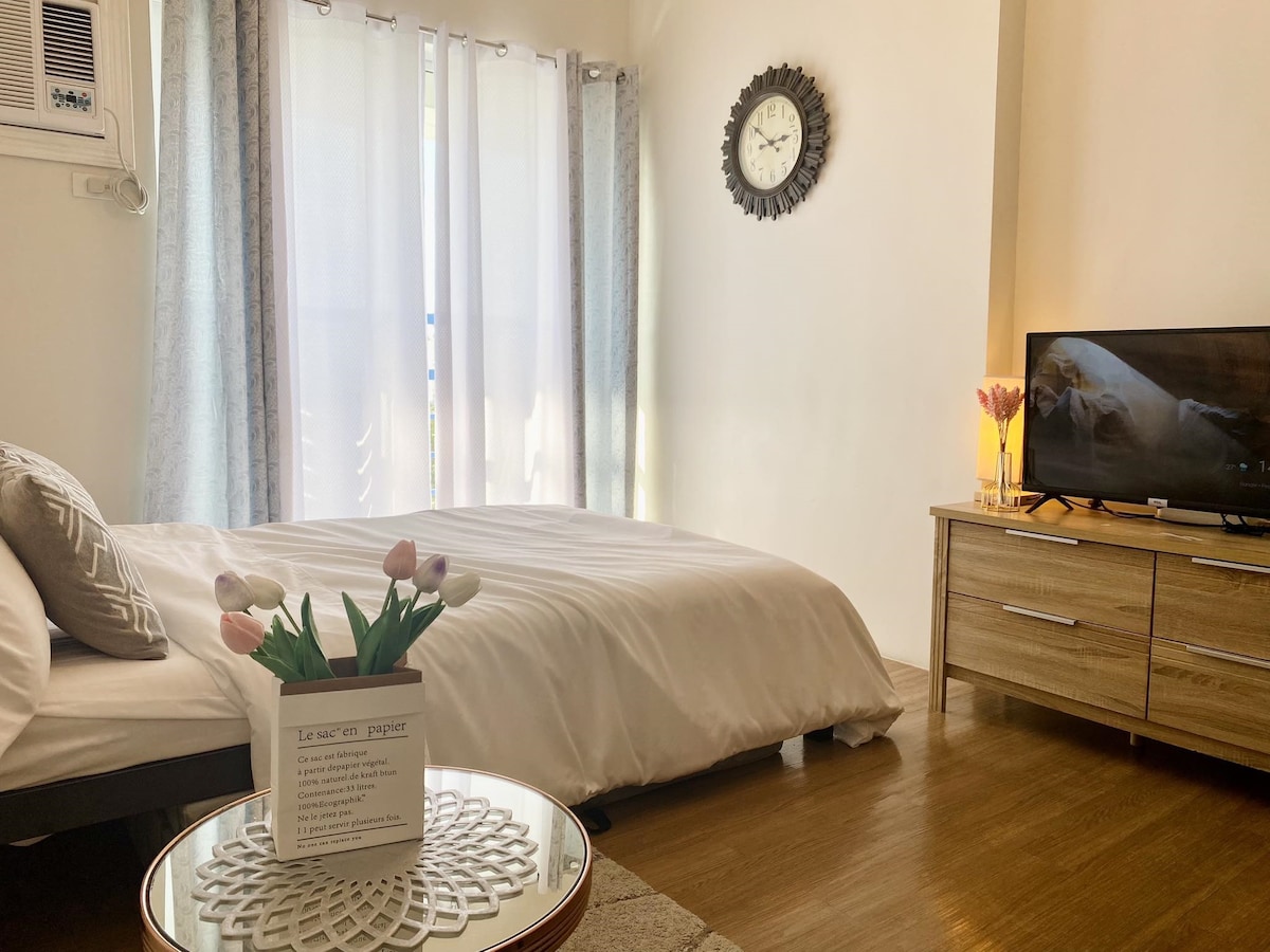 Mr. JoRCH’s condo features a full-size bed with a pull-out single bed, a 42-inch Smart TV with WiFi and Netflix, an induction stove, a microwave oven, a rice cooker, a refrigerator, and essential kitchen utensils. The bathroom is equipped with a bidet and a water heater for added convenience.