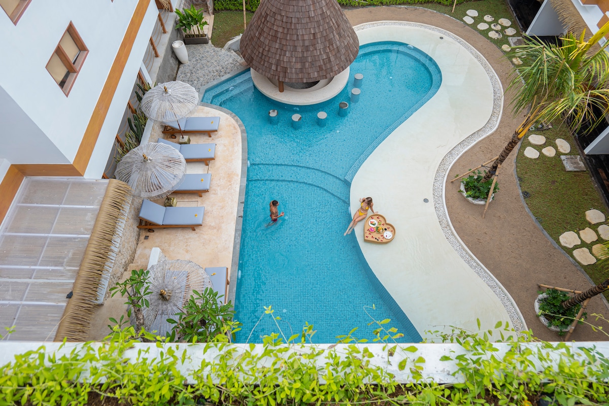 - "This resort is brand spankin' new and just fantastic. I am on my second 10-night stay in two months. I loved it so much the first time I immediately booked another trip when I found out I'd be working remotely this month. The room itself is so comfortable. I love the Google Chromecast option on the TV so much! You just scan a QR code and then you can sign into your own Netflix. This is a big plus for me haha. I haven't seen that in another hotel before. The breakfast is table service with Indo and Western options. I always opt for some items a la carte and they're totally fine with providing that for me. The pool is gorgeous! I love the swim-up bar. Who doesn't love a beer or cocktail while enjoying an infinity pool? The location is superb right next to the beach and sooo many amazing restaurants. I will say if you aren't comfortable taking a motorbike taxi you might have some difficulty as the streets are very narrow so taking a taxi is possible but traffic makes that a slow process. I was SO scared of taking a motorbike but by day 3 I felt like a local hopping on the back of one and was able to see so much more of Canggu than if I was trying to walk or taxi everywhere! It's also walking distance to an awesome gym called Body Factory and so many amazing yoga studios. It is truly a fitness girl's paradise here. And of course the staff are SO kind. 10/10 recommend all around! "