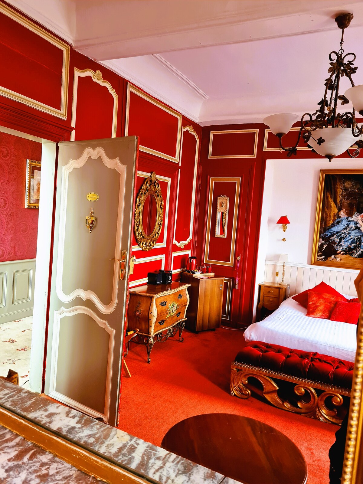 Travel in the heart of Flanders on Mount Kassel. Nuit Caline Suite with bathtub at the foot of the bed for lovers. Following the refined decoration in a remarkable hotel residence dating from the 18th century.
