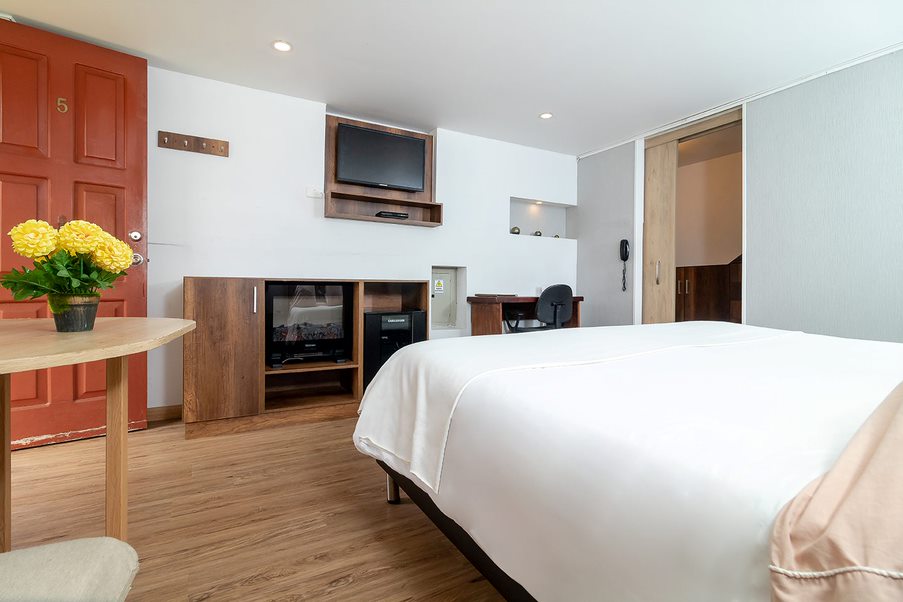 Room with an area of 15 square meters. You can select bedding between a king bed or two single beds. We can also offer you the option of a king size bed and a simple one subject to availability. The bedroom has a TV, a desk, and a private bathroom.