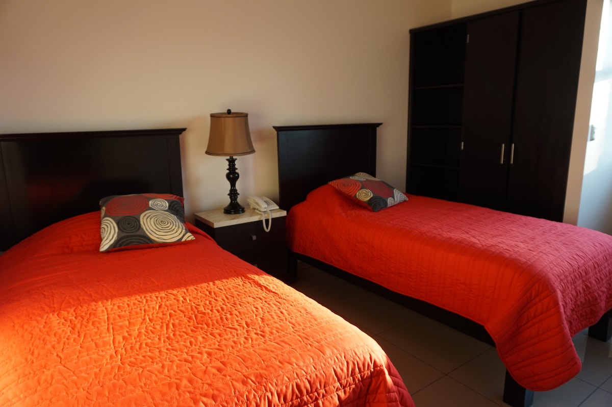 Our best space to enjoy, maximum capacity 6 people. It has two bedrooms, one with 2 single beds and another 1 King-size bed, kitchenette, terrace with excellent views, TV room with sofa bed, two complete private bathrooms, air conditioning, closet, work desk with chair, Wi-Fi or cable internet connection, 3 32"TV with cable, telephone and more amenities for you to enjoy your stay with us. All the rooms are restrictive smoking areas