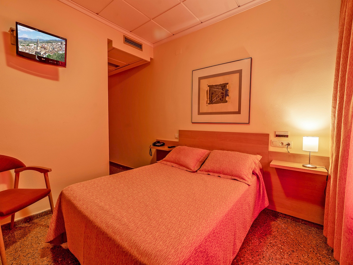 Comfort and personalized service, hotel located next to a large garden area, you will feel right at home. The hotel has 26 fully equipped rooms, with bathroom, telephone, air conditioning, heating, satellite tv, free WiFi, elevator, all in a building of 4 floors, in a beautiful building, close to the site of the Mariola mountain range and easily accessible from the highway.