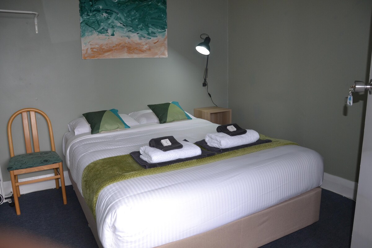 Double bed in a single room with shared bathroom, kitchen and entertaining areas.