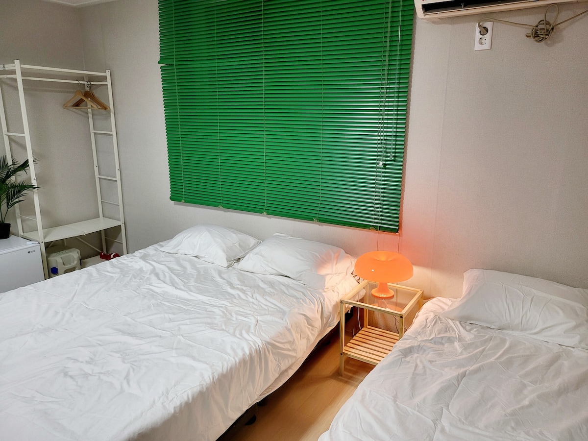 There is a queen bed and a single bed for up to 3 people to rest conveniently and comfortably, and it is equipped with a wardrobe, table, chair, refrigerator, and mirror.