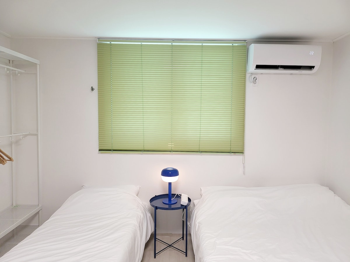There is a queen bed and a single bed for up to 3 people to rest comfortably and pleasantly, and there are closets, tables, chairs, refrigerators, and mirrors.
