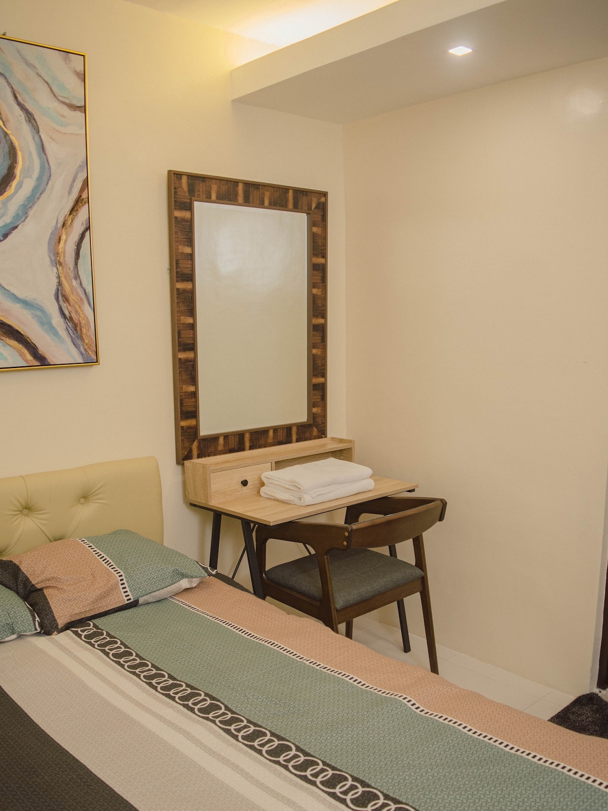 Kegama Residences has different types of rooms with unique features that will cater your needs. All rooms are fully furnished...split type aircon, 6 in Uratex mattress covered with leatherette materials and hotel quality towels and beddings. This room has refrigerator and TV, some are just ref. Lampshade/s, table clock with USB ports for easy charging and hairdryer are also available. We also have Gym and Kitchen for longer term occupants/tenants.