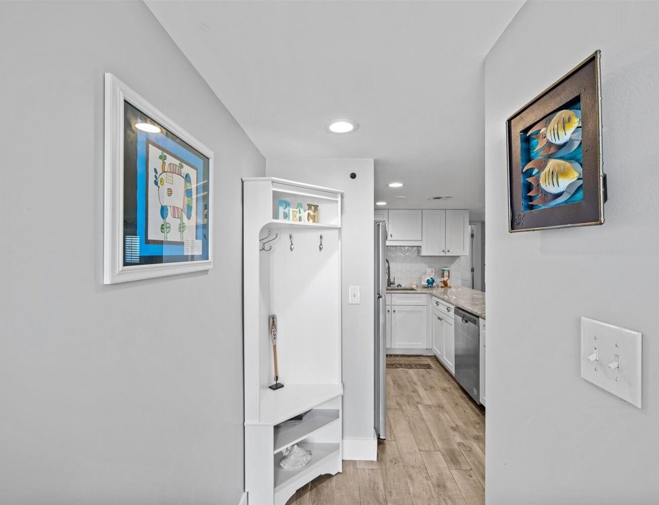 coastal colors decorate the walls. This room is fully equipped with a mini-fridge, a microwave, a toaster, a coffee pod machine, a steamer and a hairdryer. Room also has a TV and wireless internet. The entire room has a luxury vinyl flooring and has lighted ceiling fans.