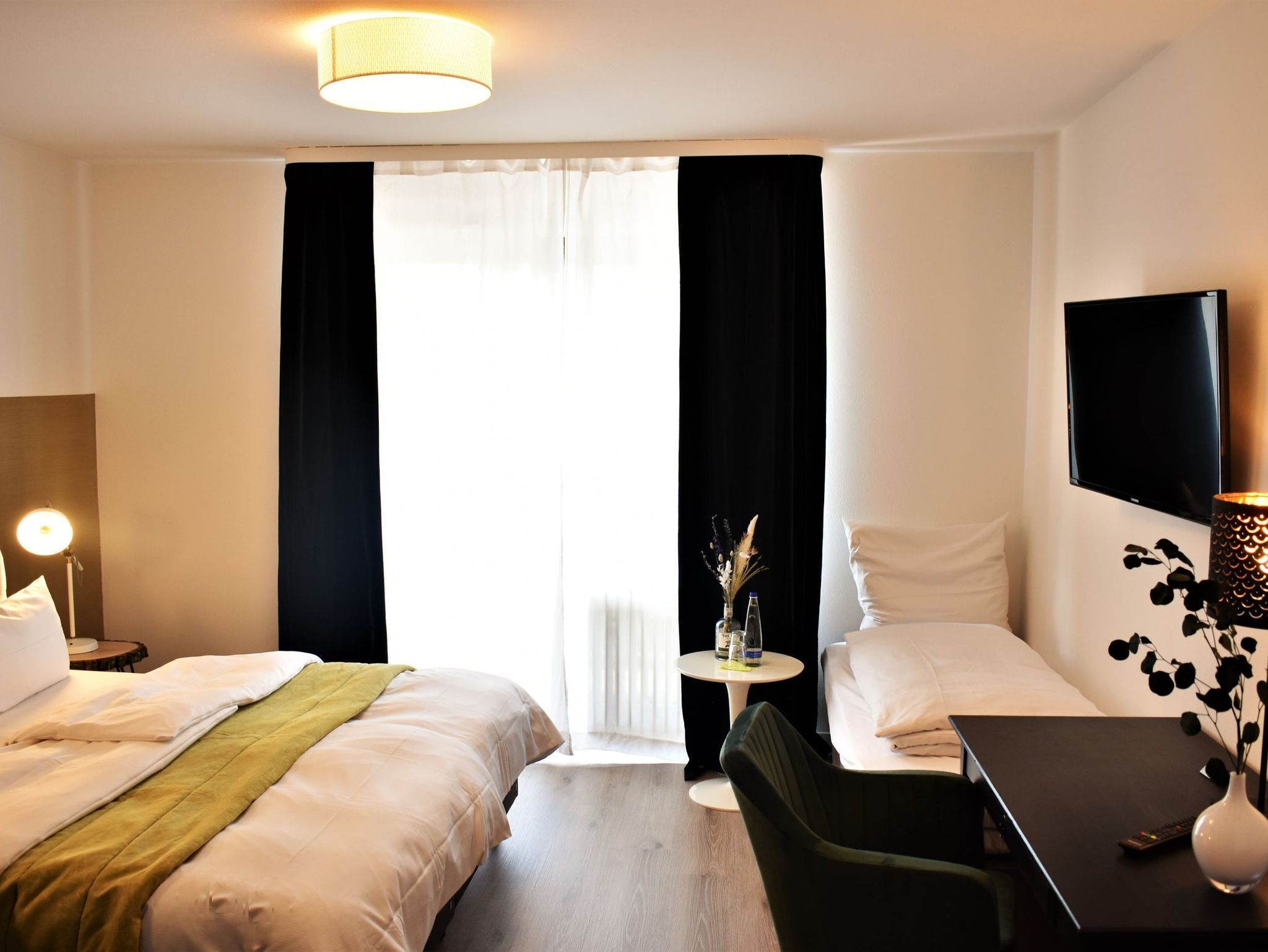 The elegantly furnished feel-good triple room with balcony is equipped with two box spring beds (90 x 200 cm), a large extra bed (80 x 190 cm), desk, armchair, flat screen TV, clock radio, telephone and safe. The bathroom has a shower, toilet, toiletries and a hairdryer. Wireless Internet connection we provide for the duration of your stay at your disposal. The comfortable box spring beds ensure that you wake up relaxed and refreshed in the morning for a deep and restful sleep. On request, we can arrange this separately from each other.