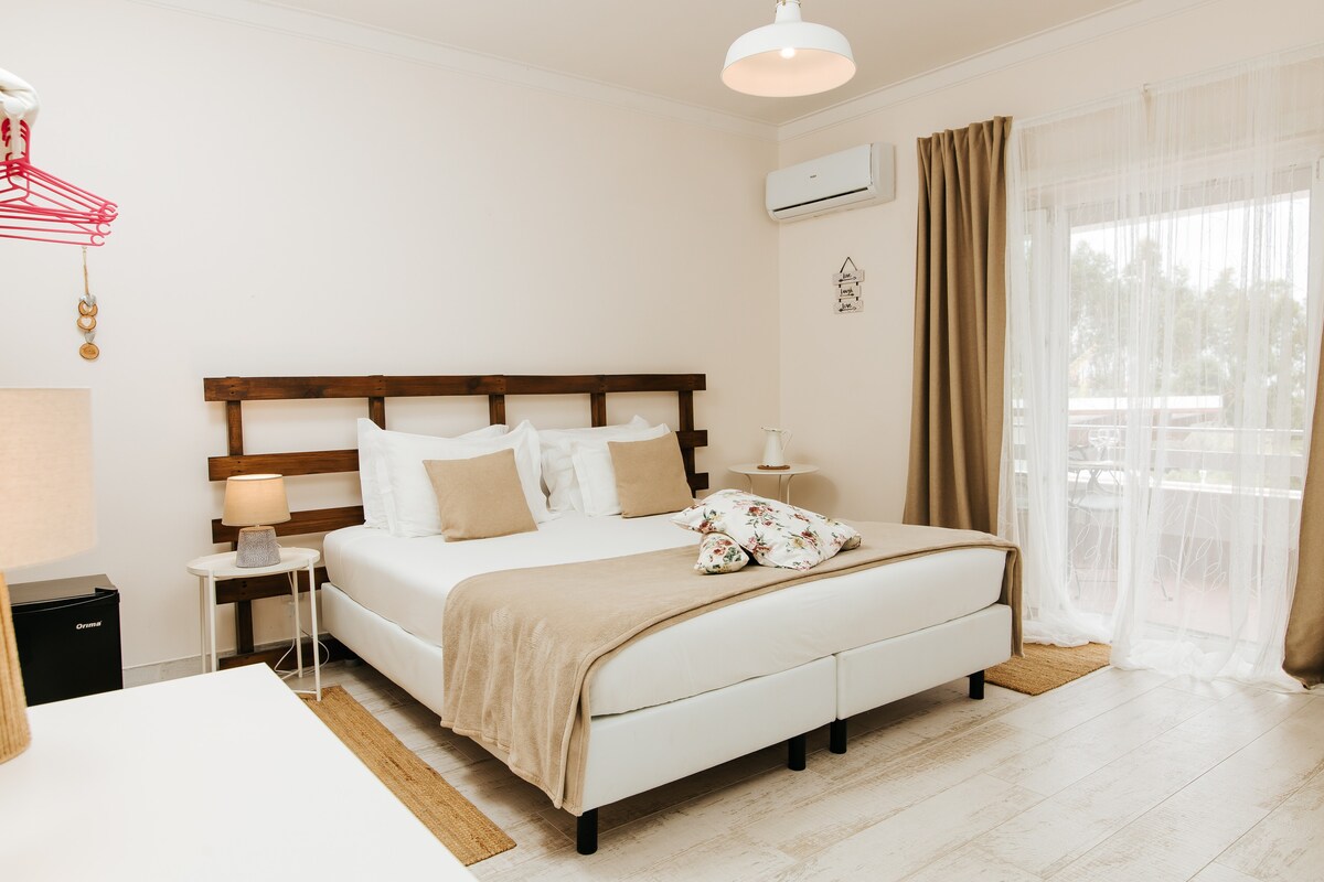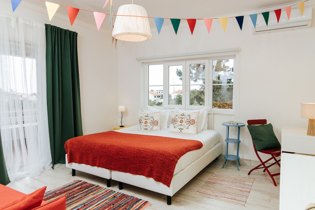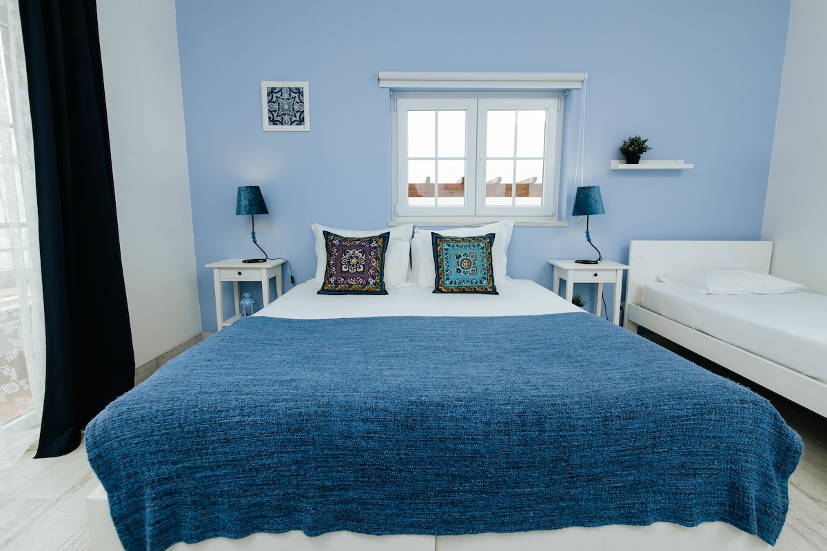 The Azulejo Suite is the perfect room to enjoy your Ericeira vacation. Clean, fresh, colorful, and modern. Enjoy the oversized king bed plus additional twin bed, sitting area, desk,mini-fridge, and double glass French doors leading to a small balcony.