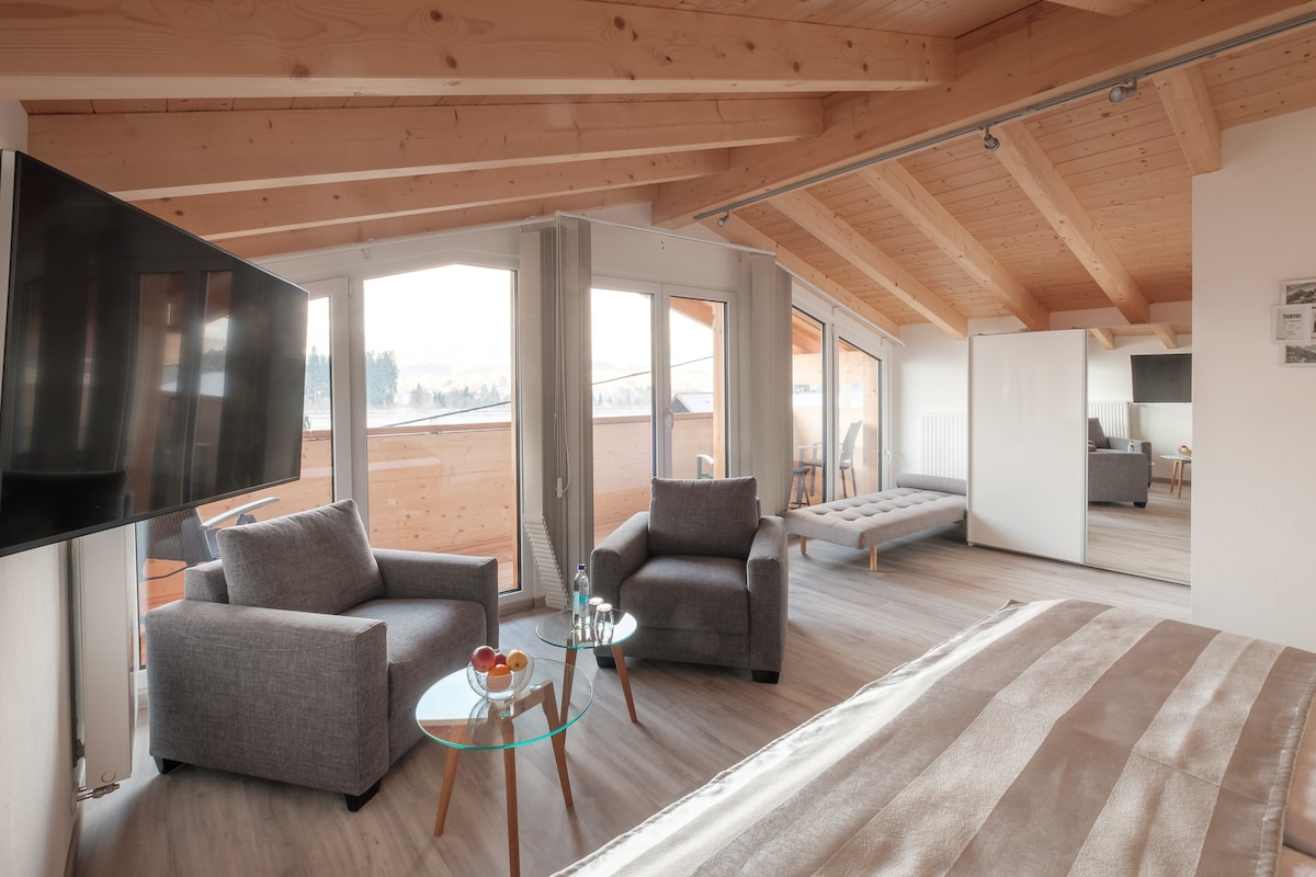 We are delighted to introduce our double room "Heuboden", which features a comfortable box-spring bed, a small kitchenette, and a bright, naturally lit bathroom. A special highlight is the south-facing balcony, where you can enjoy a stunning mountain view – the perfect spot to relax.