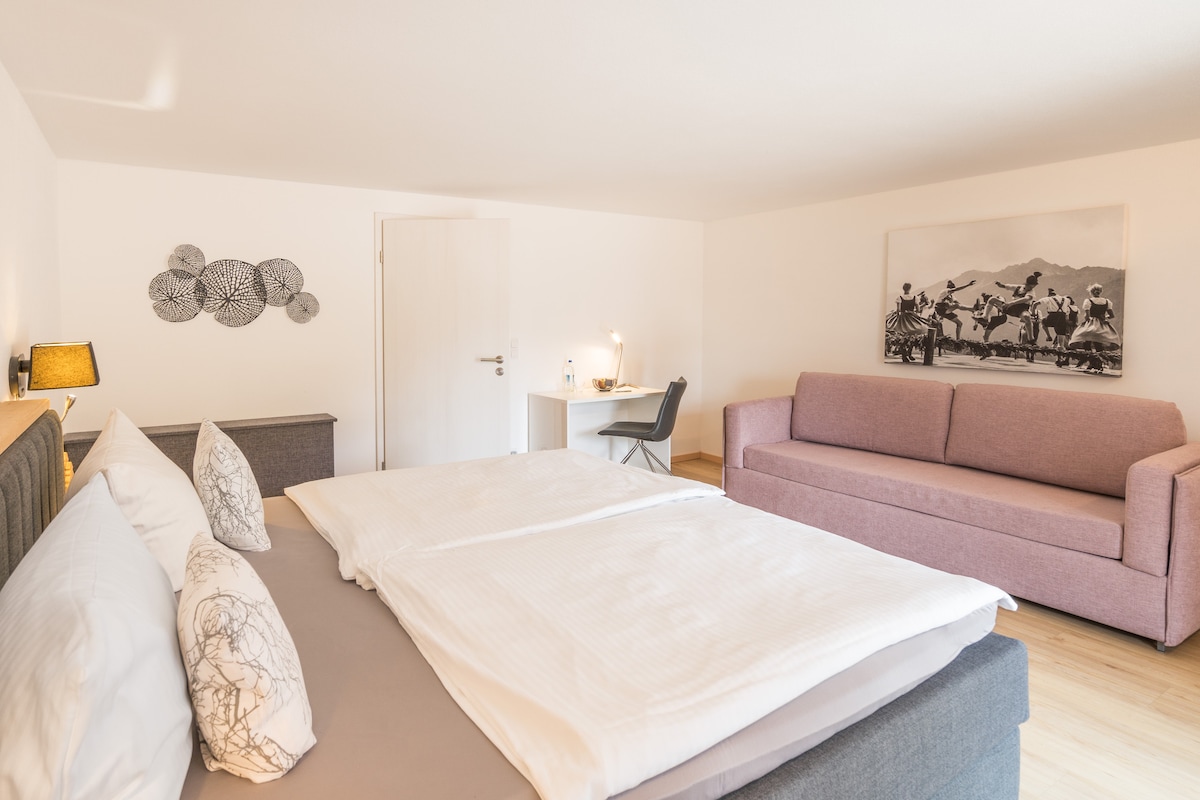 The "Zicklein" is our single room, featuring a small desk, a box-spring sofa bed, and a bright, naturally lit bathroom. It also offers a beautiful view of the Rubihorn mountain.